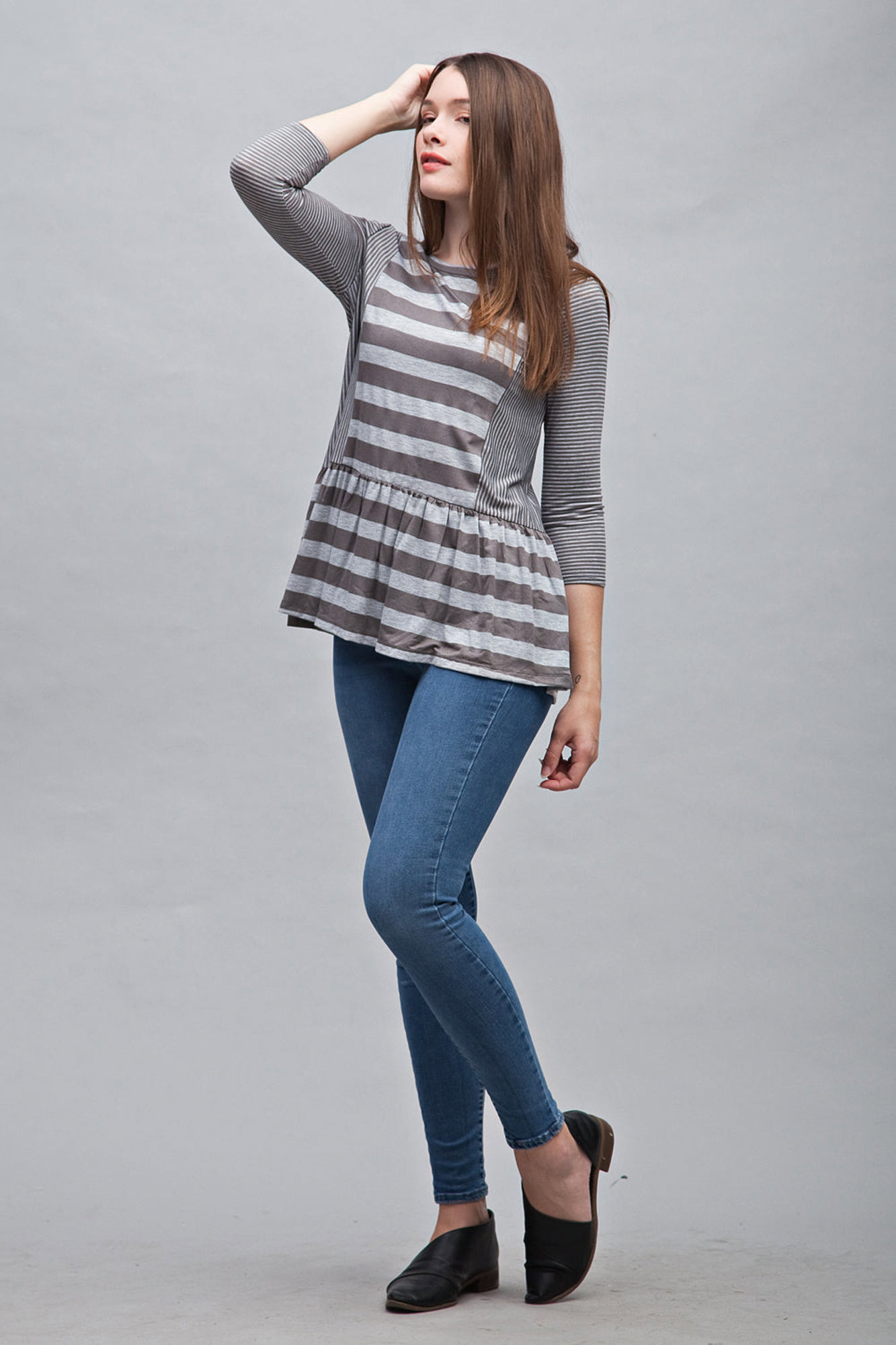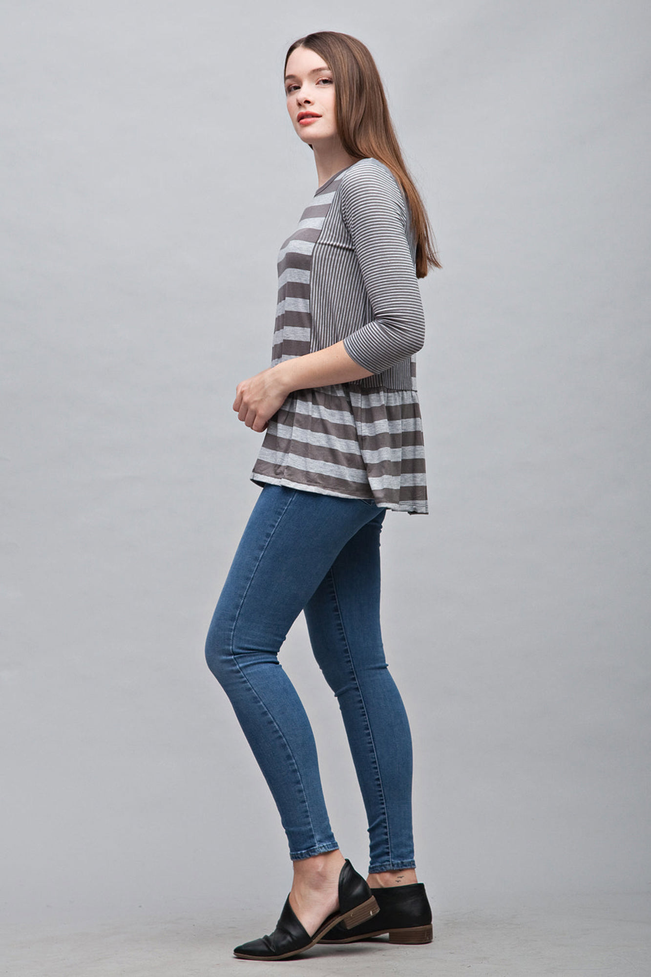 The cutest striped tunic top! This top is extremely flattering on all body types thanks to the thoughtful design placement of the contrasting stripes. It has a simple round neckline, 3/4 length sleeves, and a delightful ruffle drop waist.
