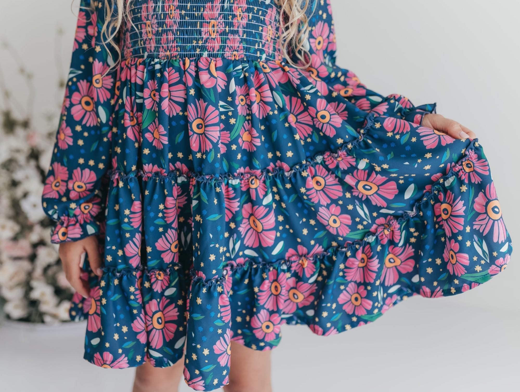 This playful Grace Hot Pink Dress features a charming blue and pink floral print with long sleeves and a flirty three-tiered skirt. The trendy smocking detail adds a fun, textured touch that moves beautifully with you. Perfect for brightening up any day with a splash of color and style! Great for back to school in the fall!