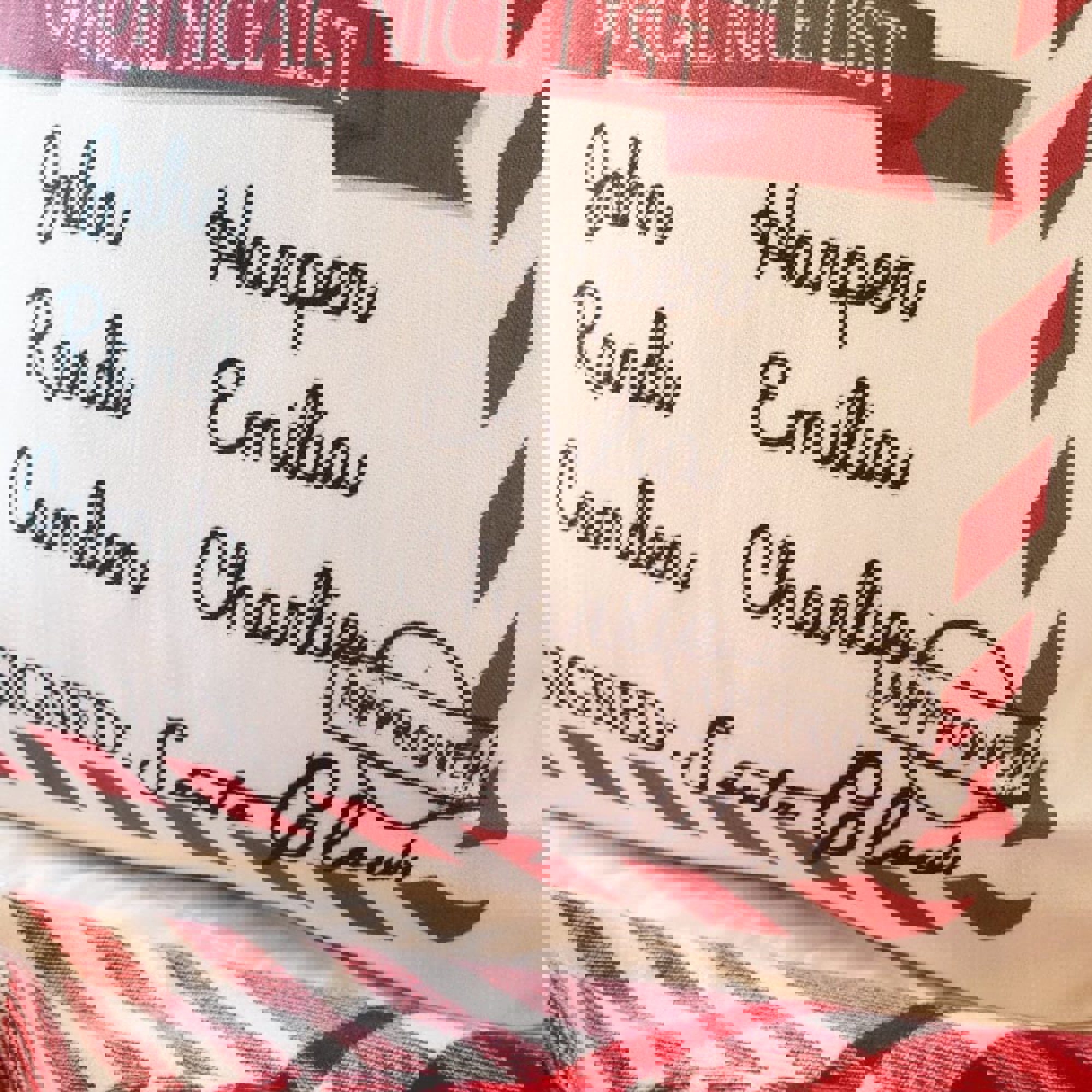 Available in a natural colored linen. This cover features a zipper on the bottom for closure. We can fit up to 10 names on the pillow cover. Please type them in the exact order you would like they displayed.