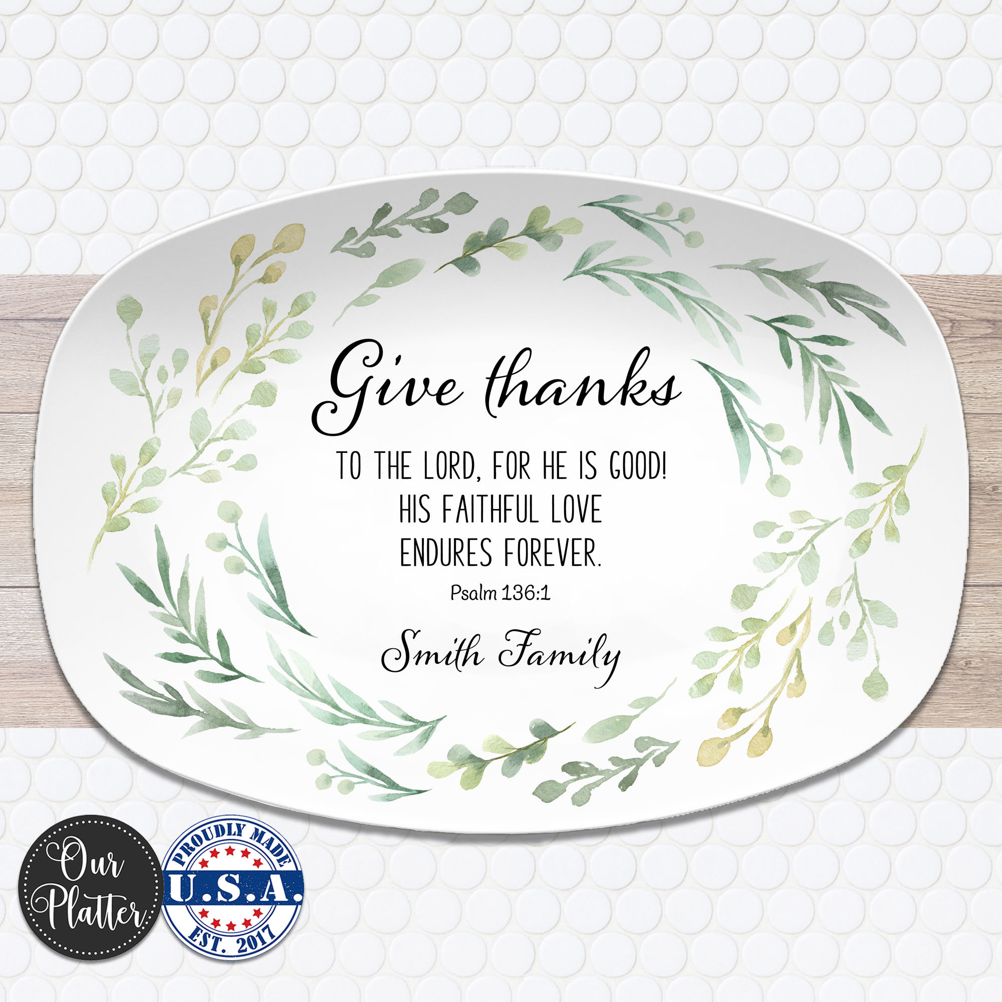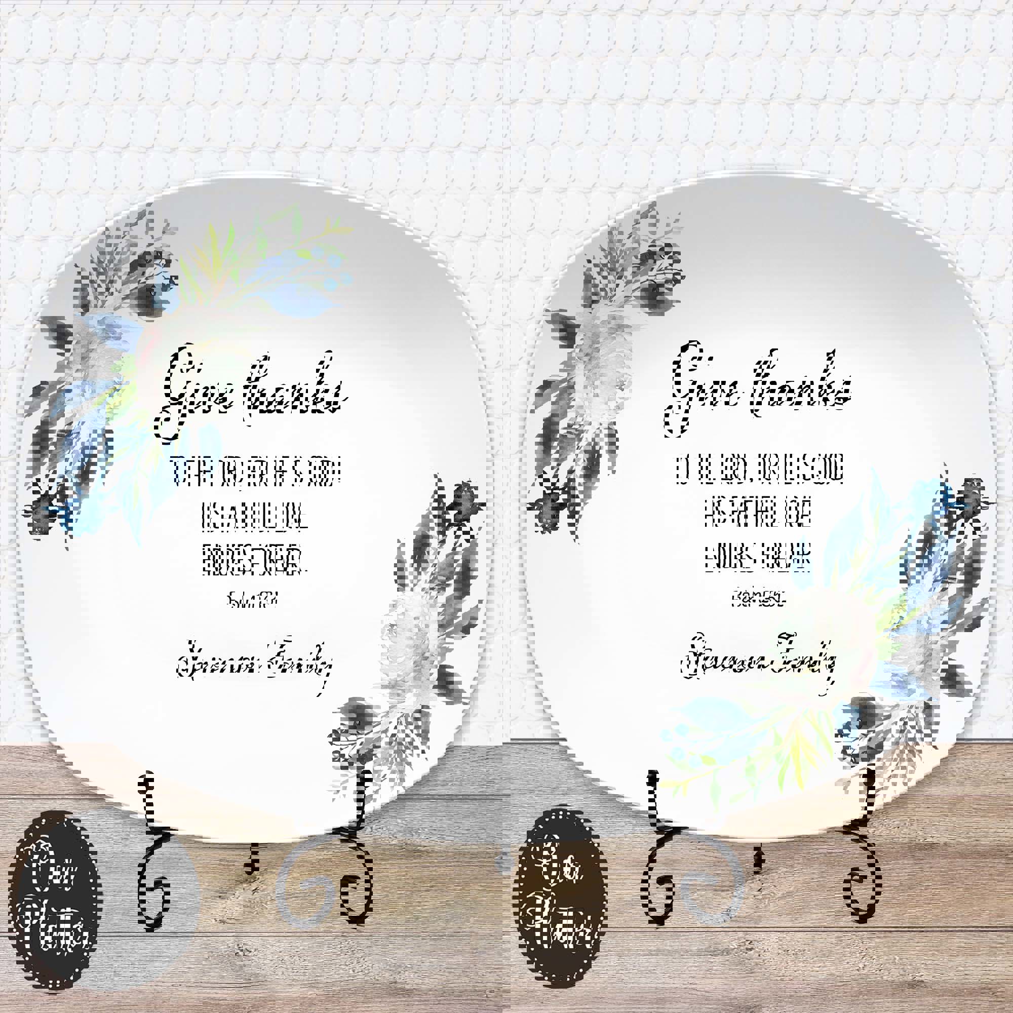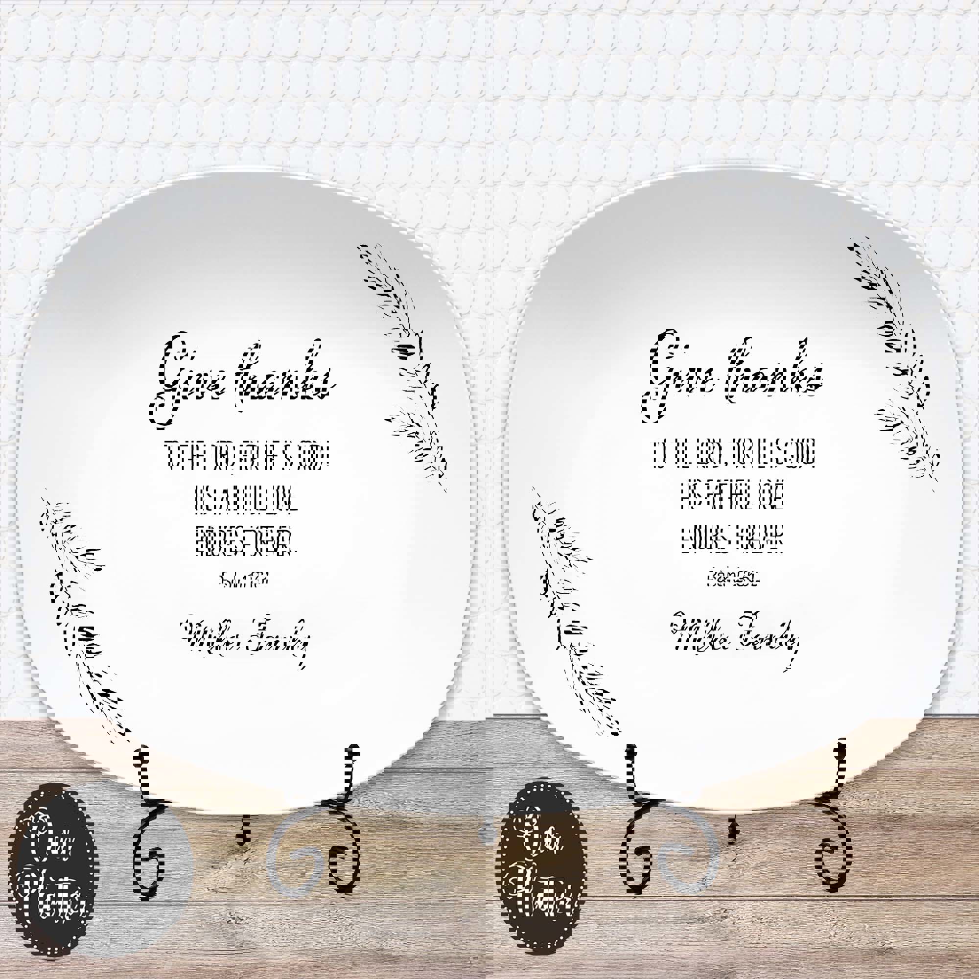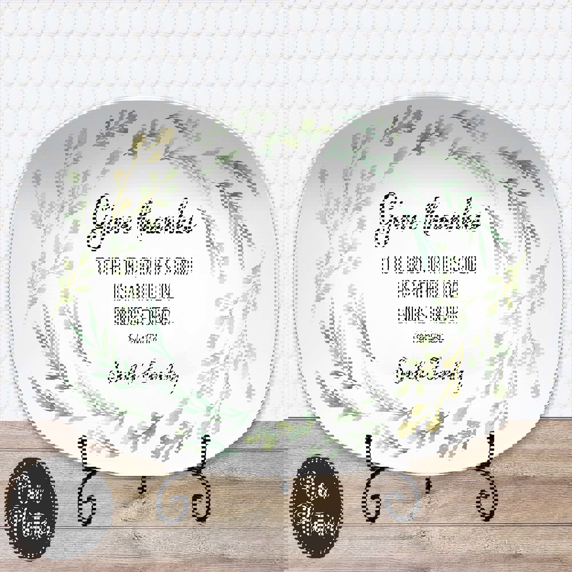 The Give Thanks platter features a scripture with family name. It is an Inspirational home decor gift for everyday use or special gatherings. Each platter is customized with your family name, making it a meaningful keepsake or gift for loved ones. Whether used as a serving dish, display piece, or thoughtful hostess gift, it adds warmth and purpose to any table.