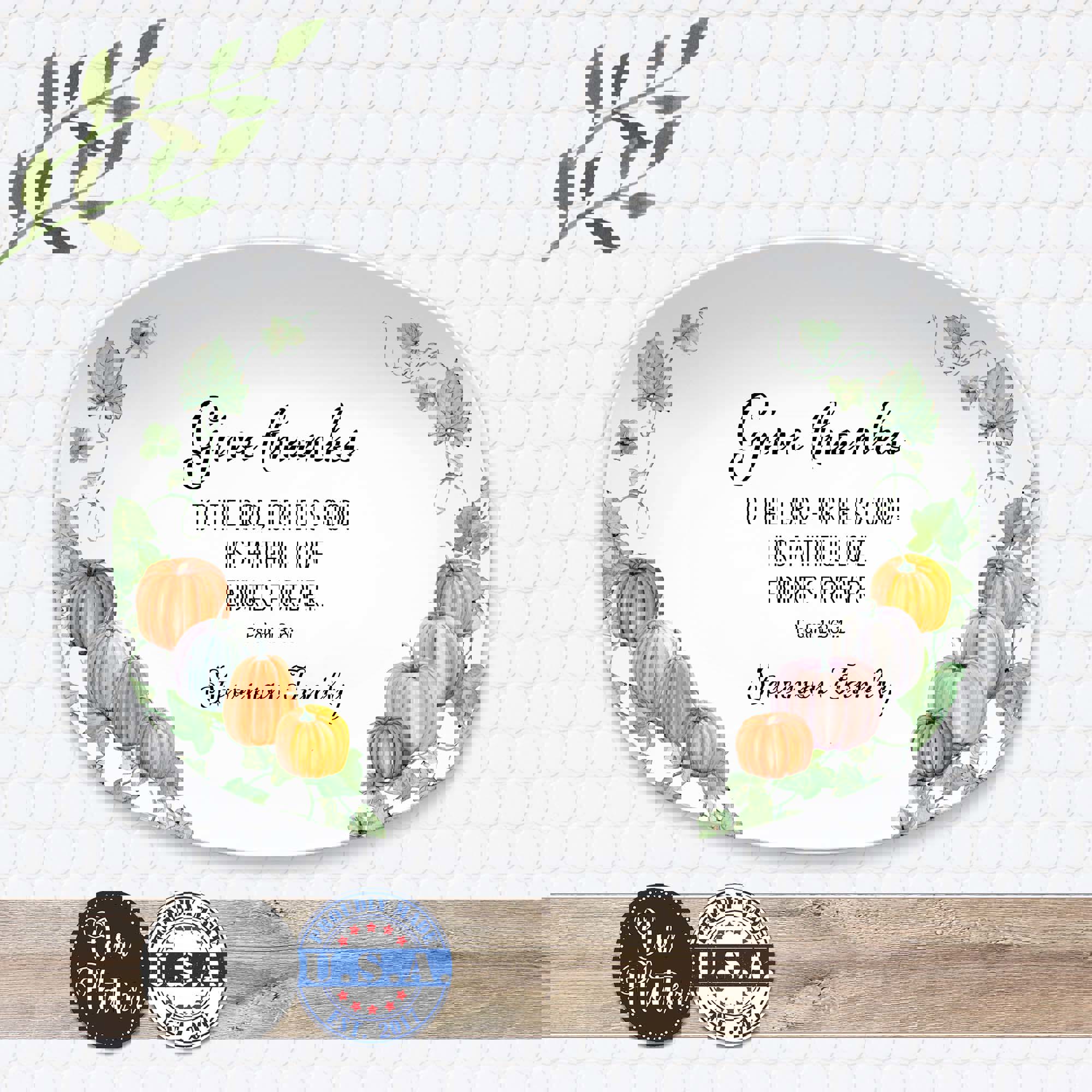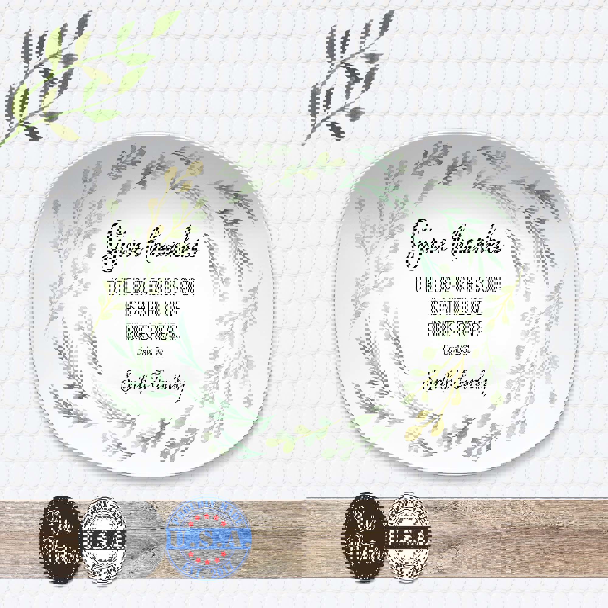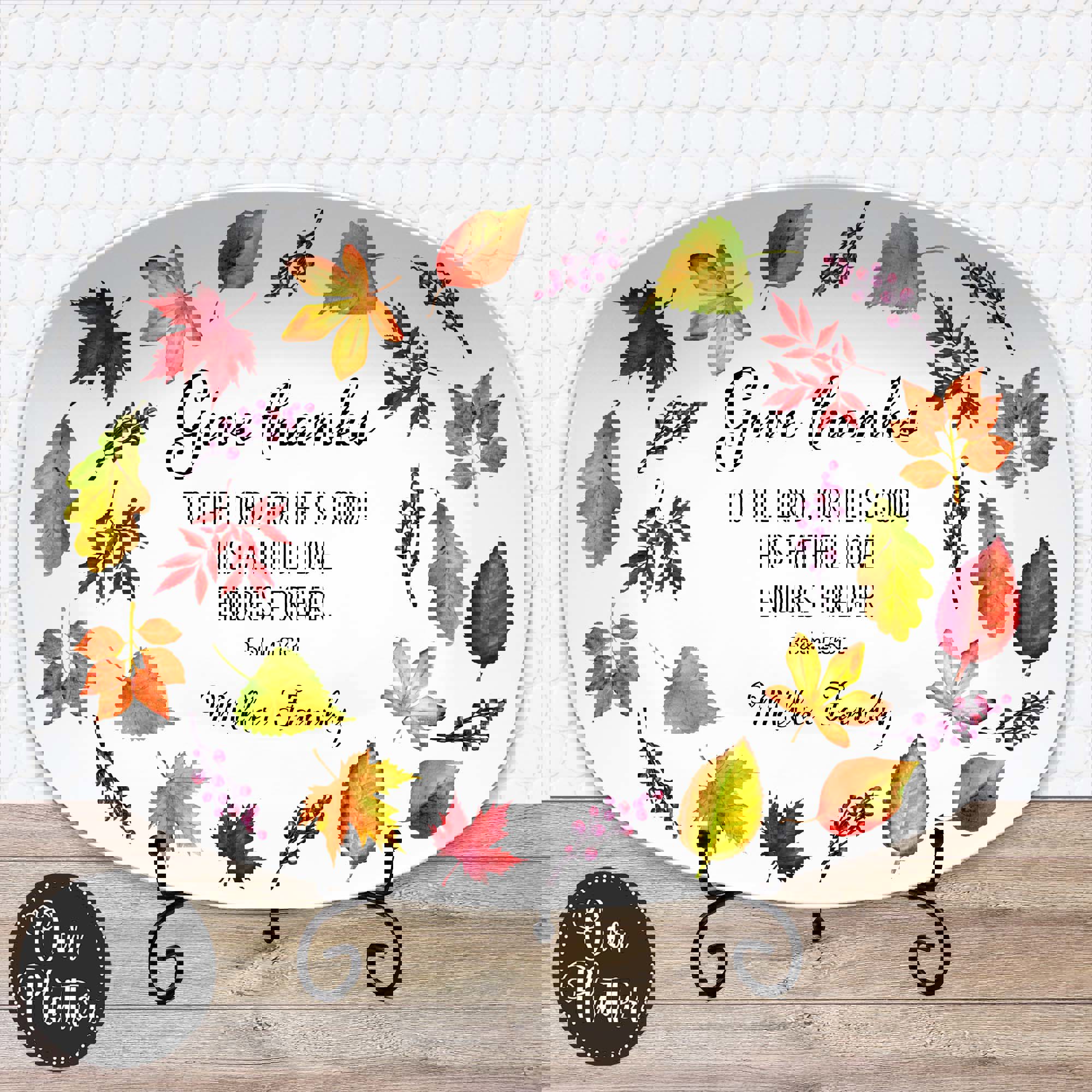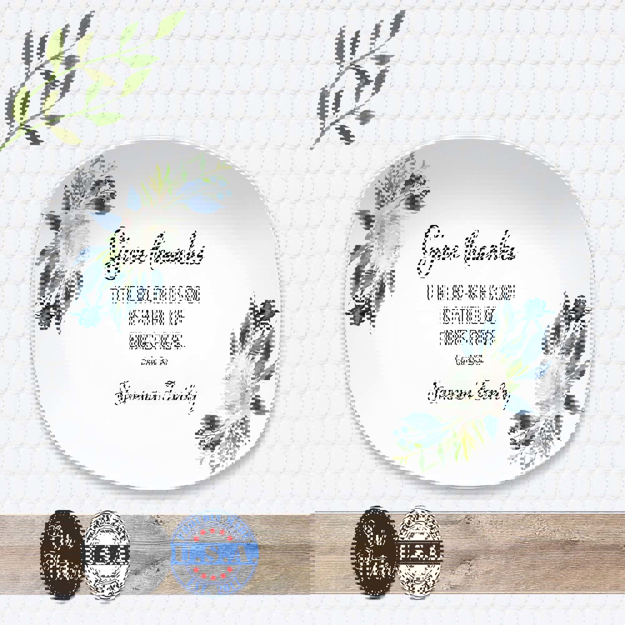 The Give Thanks platter features a scripture with family name. It is an Inspirational home decor gift for everyday use or special gatherings. Each platter is customized with your family name, making it a meaningful keepsake or gift for loved ones. Whether used as a serving dish, display piece, or thoughtful hostess gift, it adds warmth and purpose to any table.