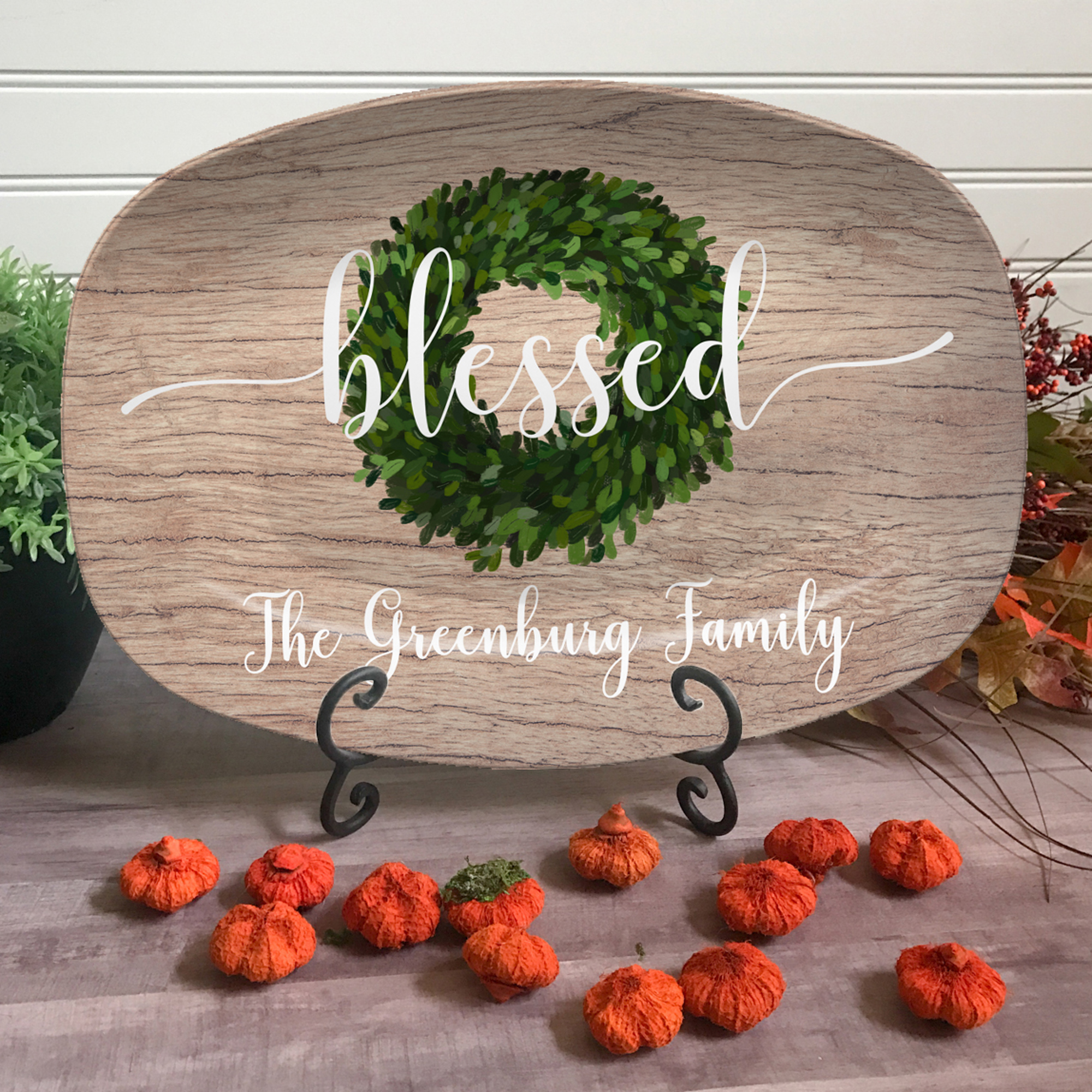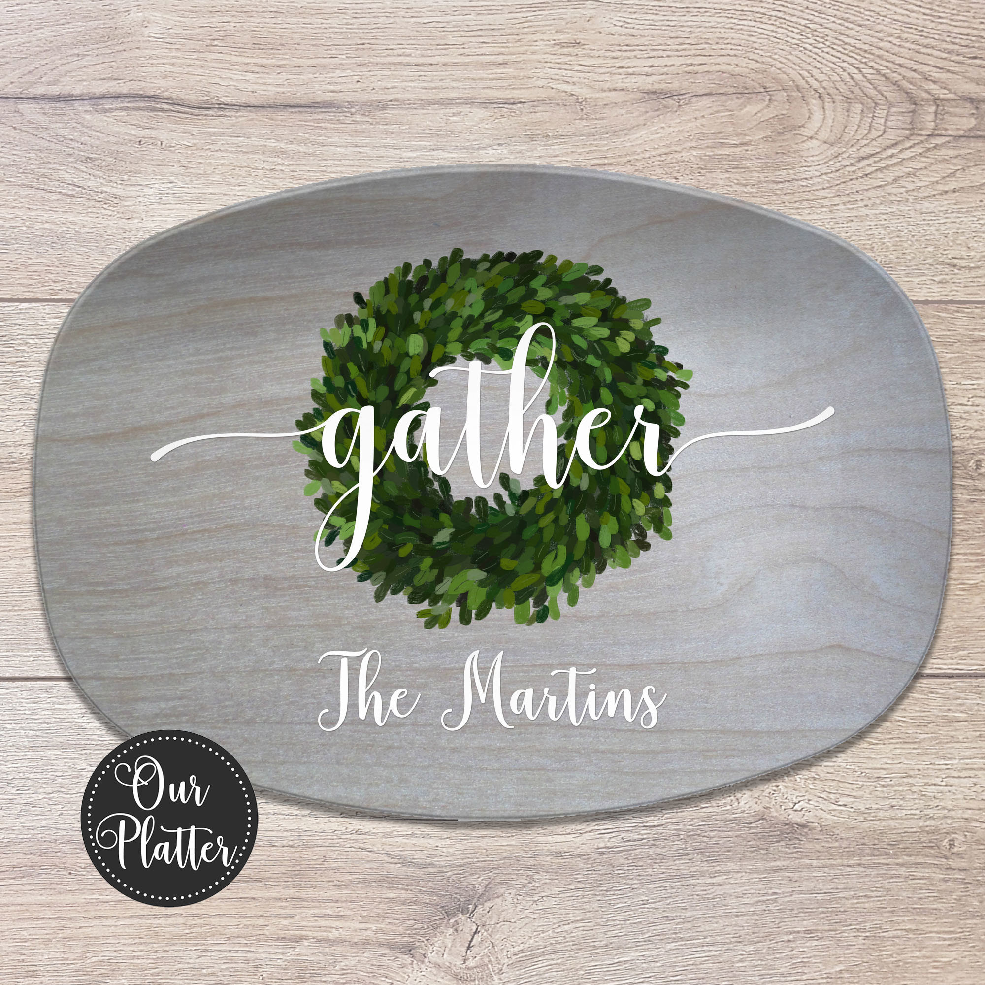 Custom holiday serving tray with boxwood & red berry design, perfect for Thanksgiving, family gatherings, and gifts. Celebrate family, gatherings, and special moments with our Personalized Family Platter. This versatile platter is more than just serveware—it’s a keepsake that adds charm to your table and kitchen décor. Personalize it with your family name, a meaningful word, or a special message to make it uniquely yours.