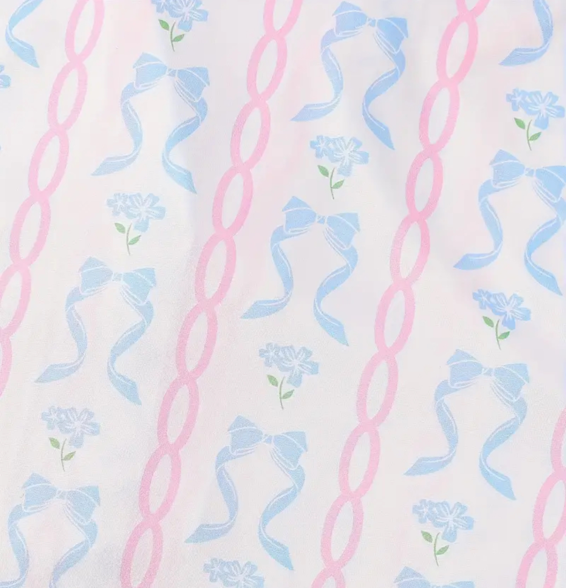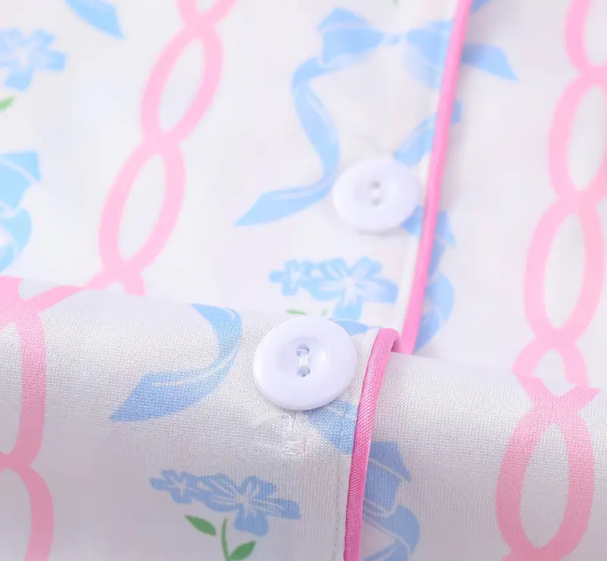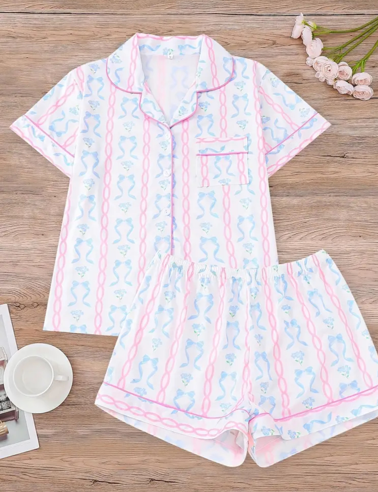 Such a cute comfortable pajama set with whimsical pink trellises and blue bows. Button front top with elastic waist bottoms. 95% Polyester 5% Elastane. Machine washable .
