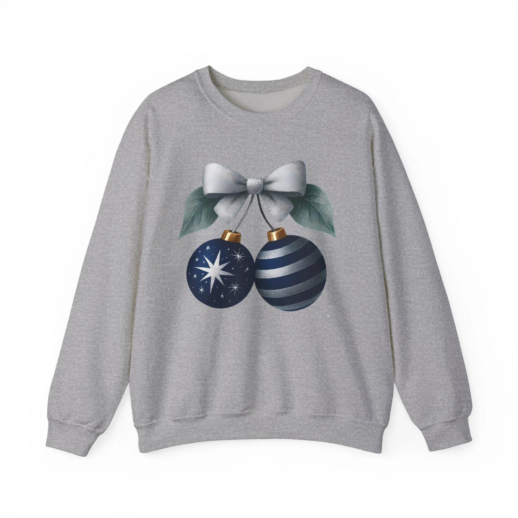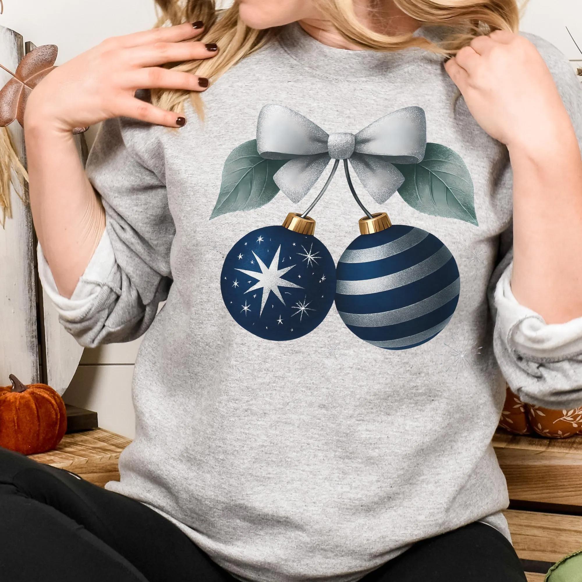Celebrate the Festival of Lights in style with this Coquette Cherries Hanukkah Sweatshirt—where vintage-inspired charm meets holiday sparkle. Featuring a shimmering silver bow, frosty green leaves, and a pair of navy blue “cherry” ornaments (one adorned with glittering silver stars, the other wrapped in silver stripes), this design is perfect for menorah lightings, family gatherings, and cozy winter nights.