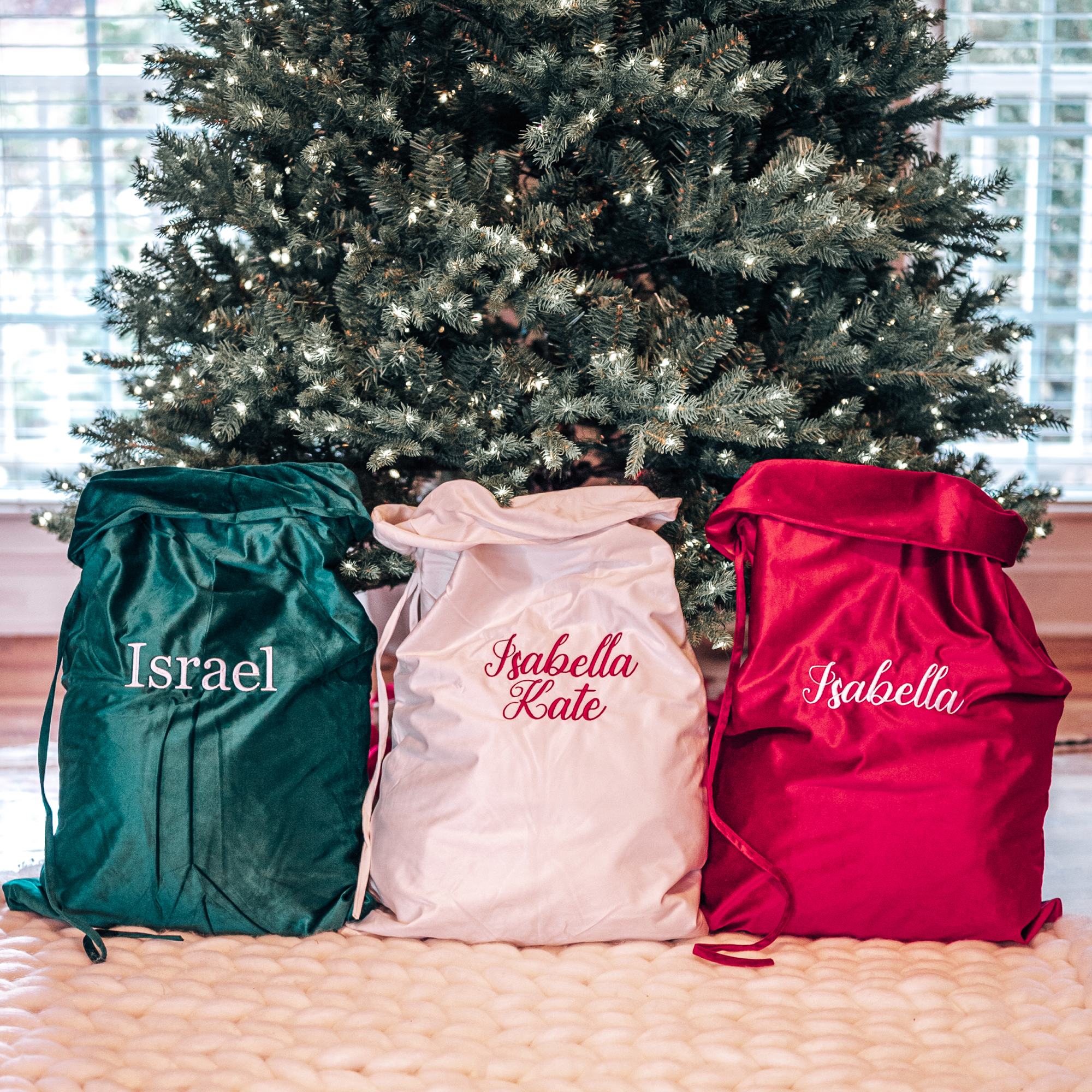 These are the best Personalized Christmas Santa Sacks! Made with large custom embroidery, these Velvet Santa Sacks are a keepsake. These Personalized Santa Sacks are perfect for a large Christmas gift bag, or to use as an extra large Christmas stocking sack. Our Custom Embroidered Personalized Santa Sacks add a special touch to Christmas!