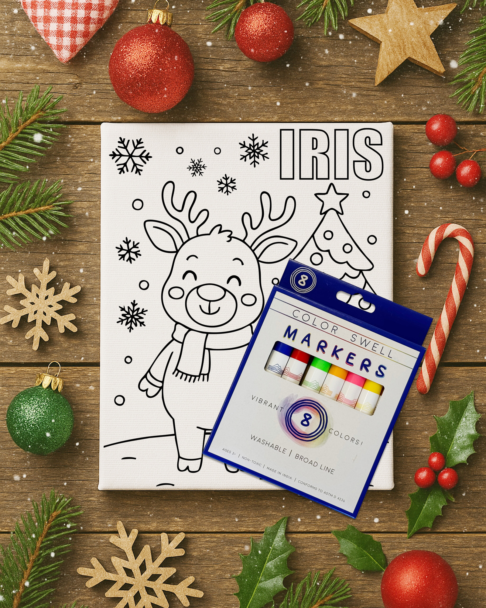 Let your little artist color their own Christmas magic! Our Color-Me Christmas Canvas is a personalized 8×10 UV-printed coloring canvas available in Reindeer, Snowman, or Gingerbread Man designs. Each canvas features your child’s name and includes a pack of washable markers—perfect for stocking stuffers, Christmas Eve boxes, classroom gifts, and holiday fun. A festive keepsake they’ll treasure year after year!