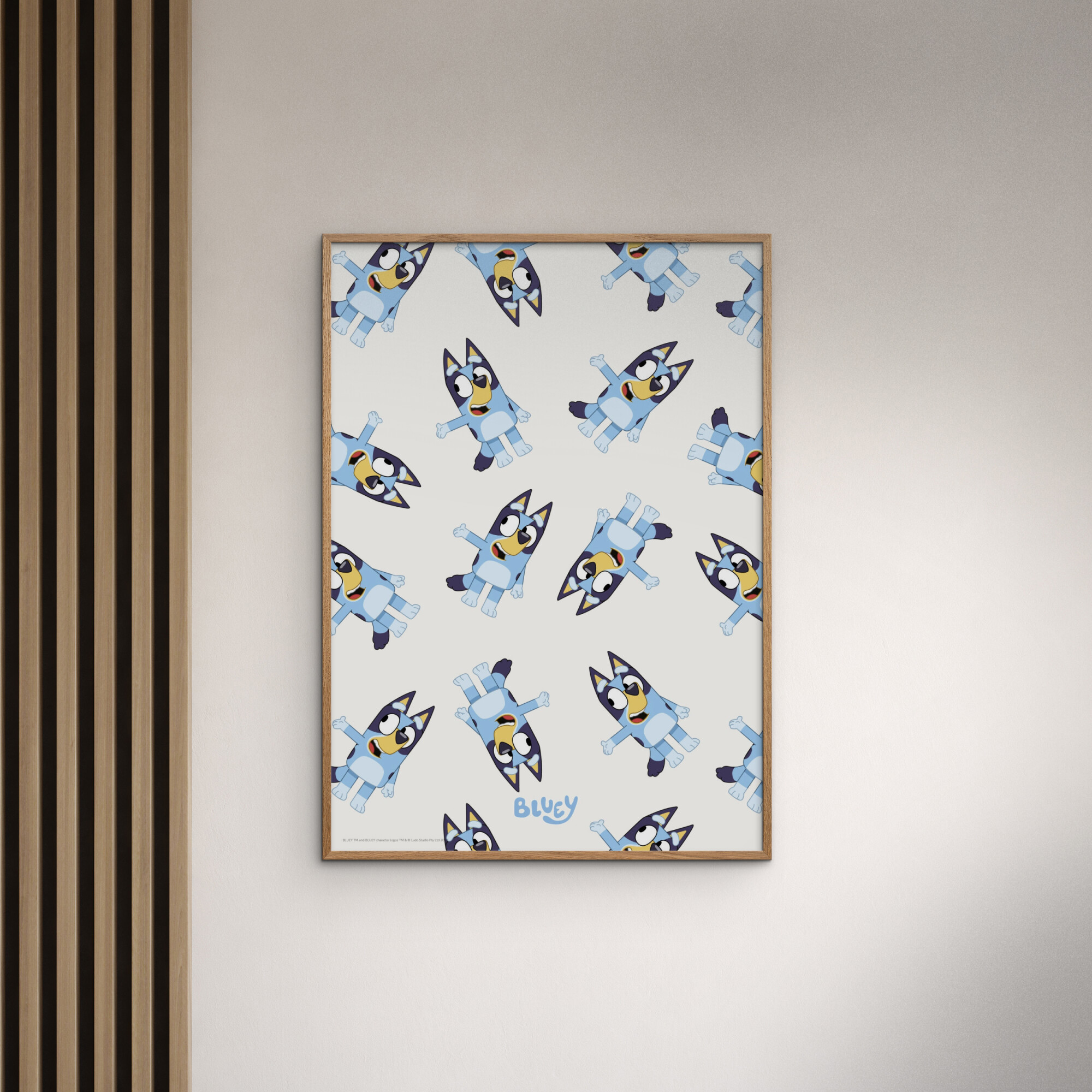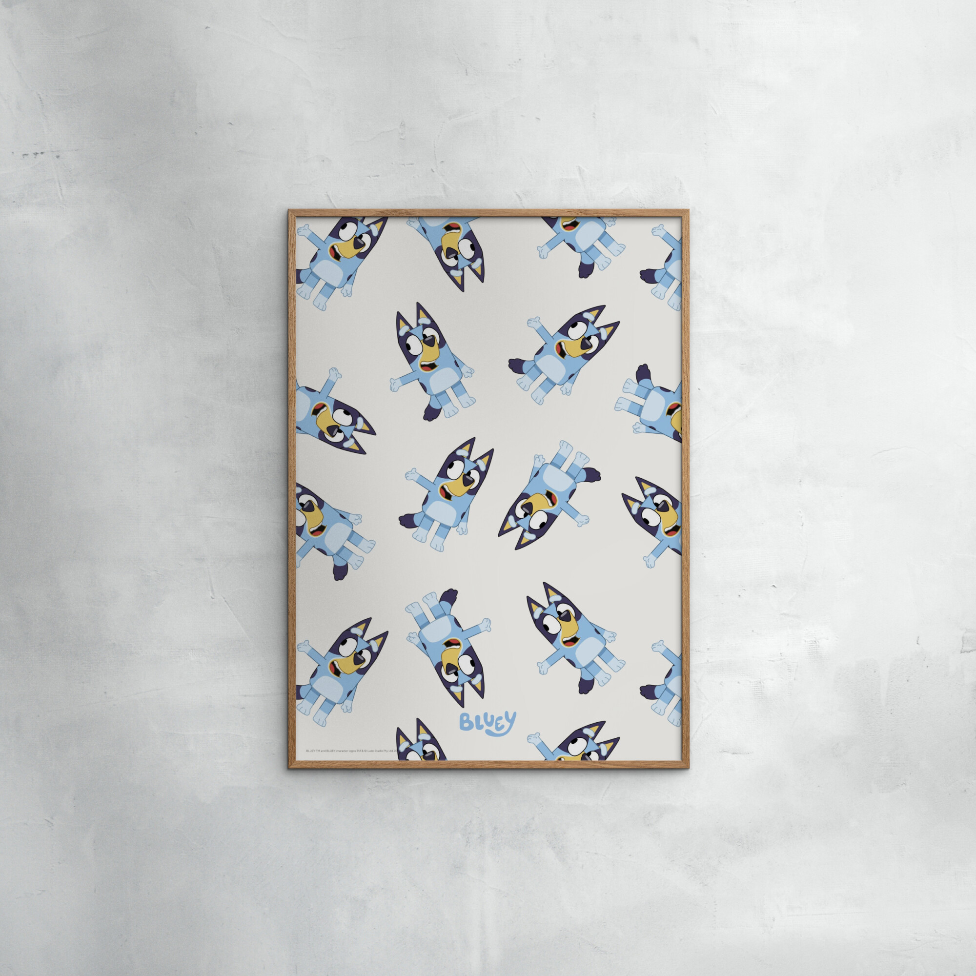 Frame not included. Showcase your love for Bluey with this minimalist, repeating pattern design. This playful print works great as wallpaper-style décor or as a feature on its own for fans of the cheeky blue pup.
