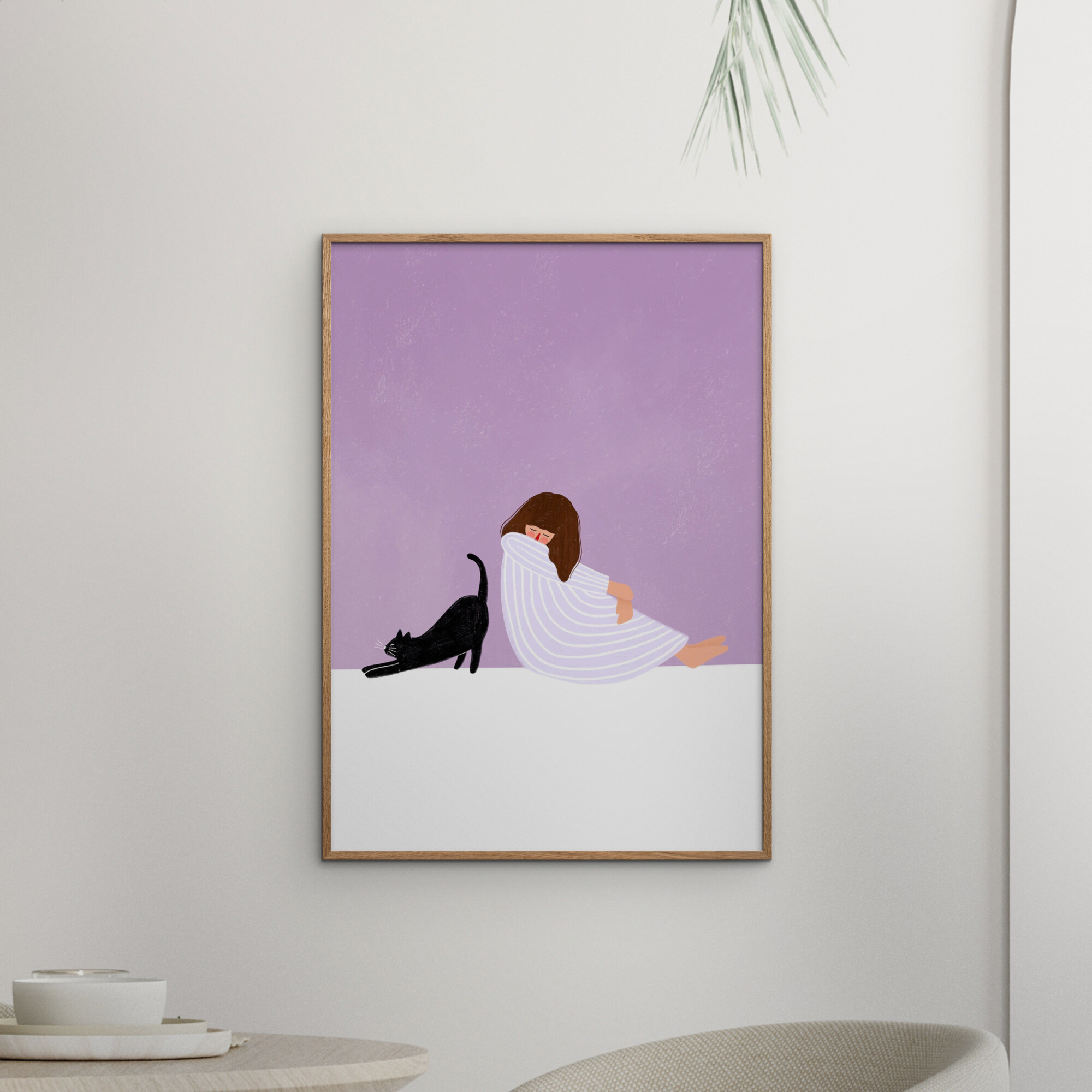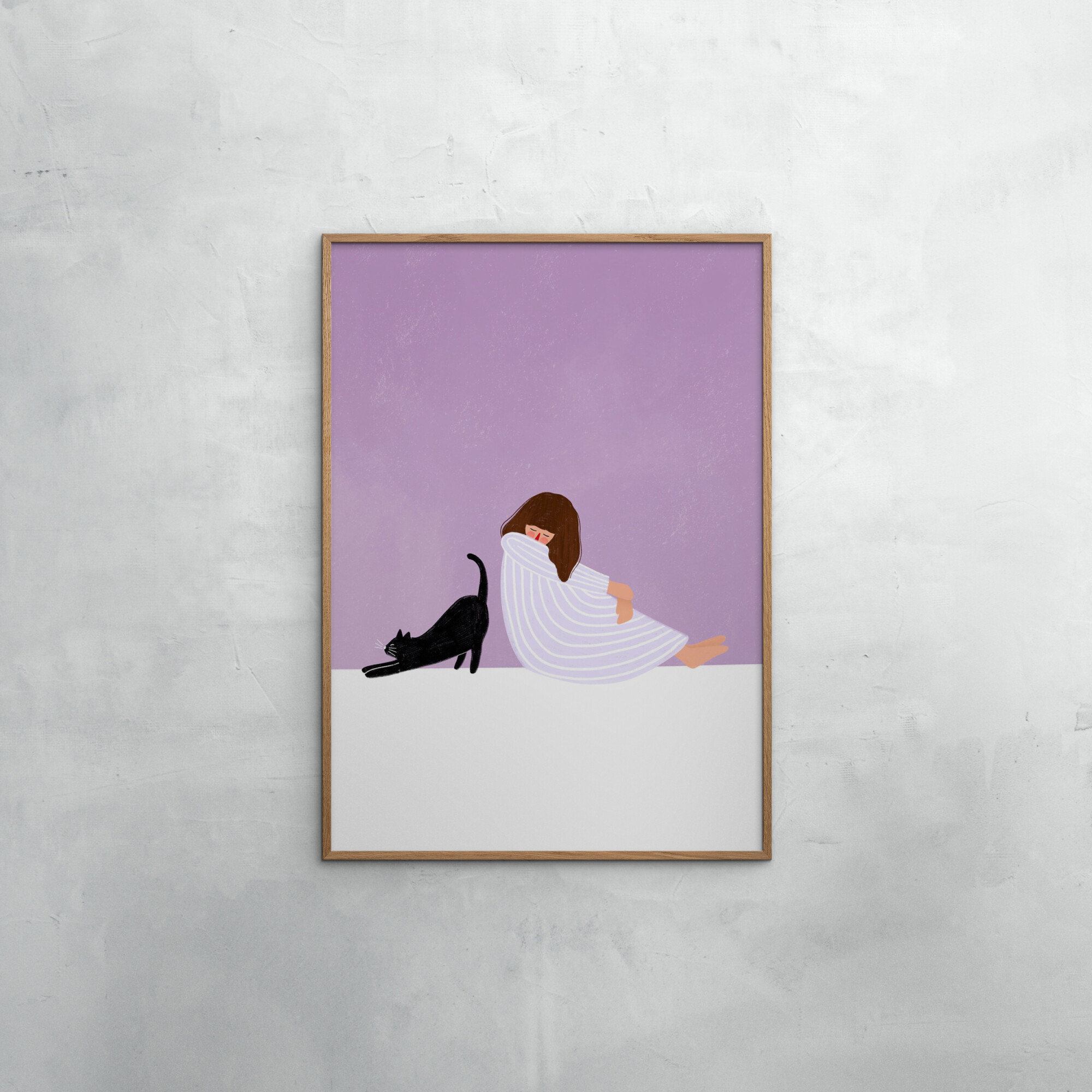 Frame not included. This enchanting poster features a whimsical illustration of a girl and her feline companion set against a dreamy purple backdrop. Perfect for cat lovers and art enthusiasts, it adds a touch of magic and charm to any space, capturing the essence of companionship and imagination.