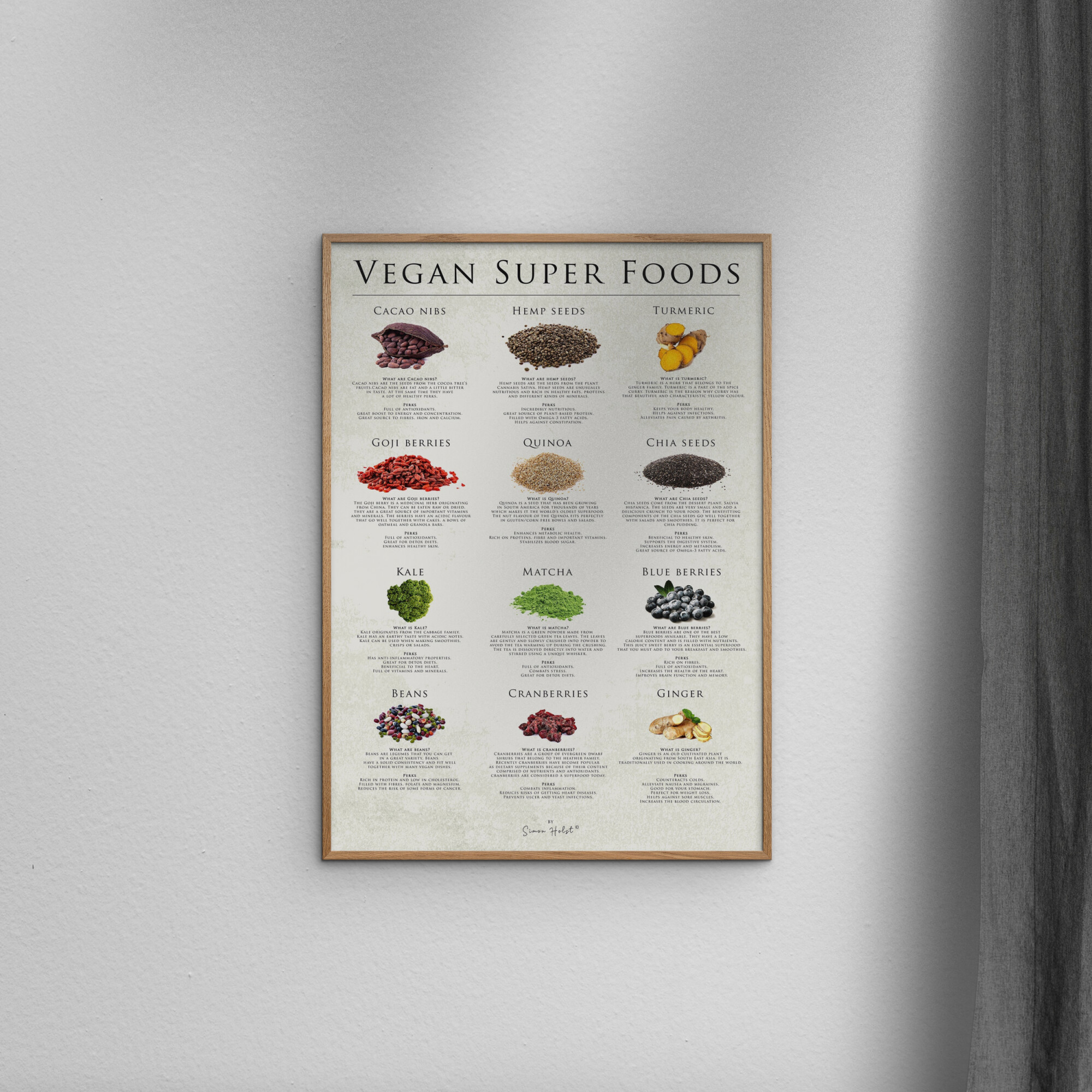 Frame not included. Discover the vibrant world of vegan superfoods with Simon Holst's poster. Featuring a colorful array of nutrient-rich ingredients, this visually stunning piece is perfect for health enthusiasts and plant-based food lovers. Elevate your kitchen decor while embracing a lifestyle of wellness and vitality.