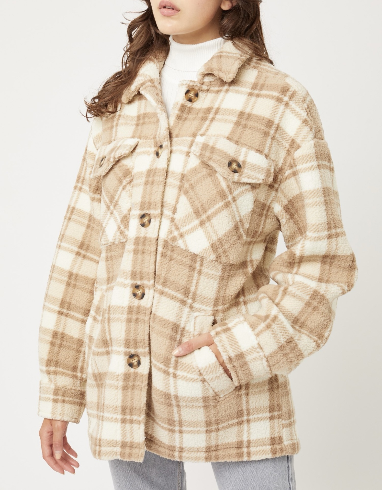 Experience ultimate comfort and style with our Sherpa Checker Jacket. This oversized jacket not only keeps you warm, but also adds a trendy touch to your outfit.