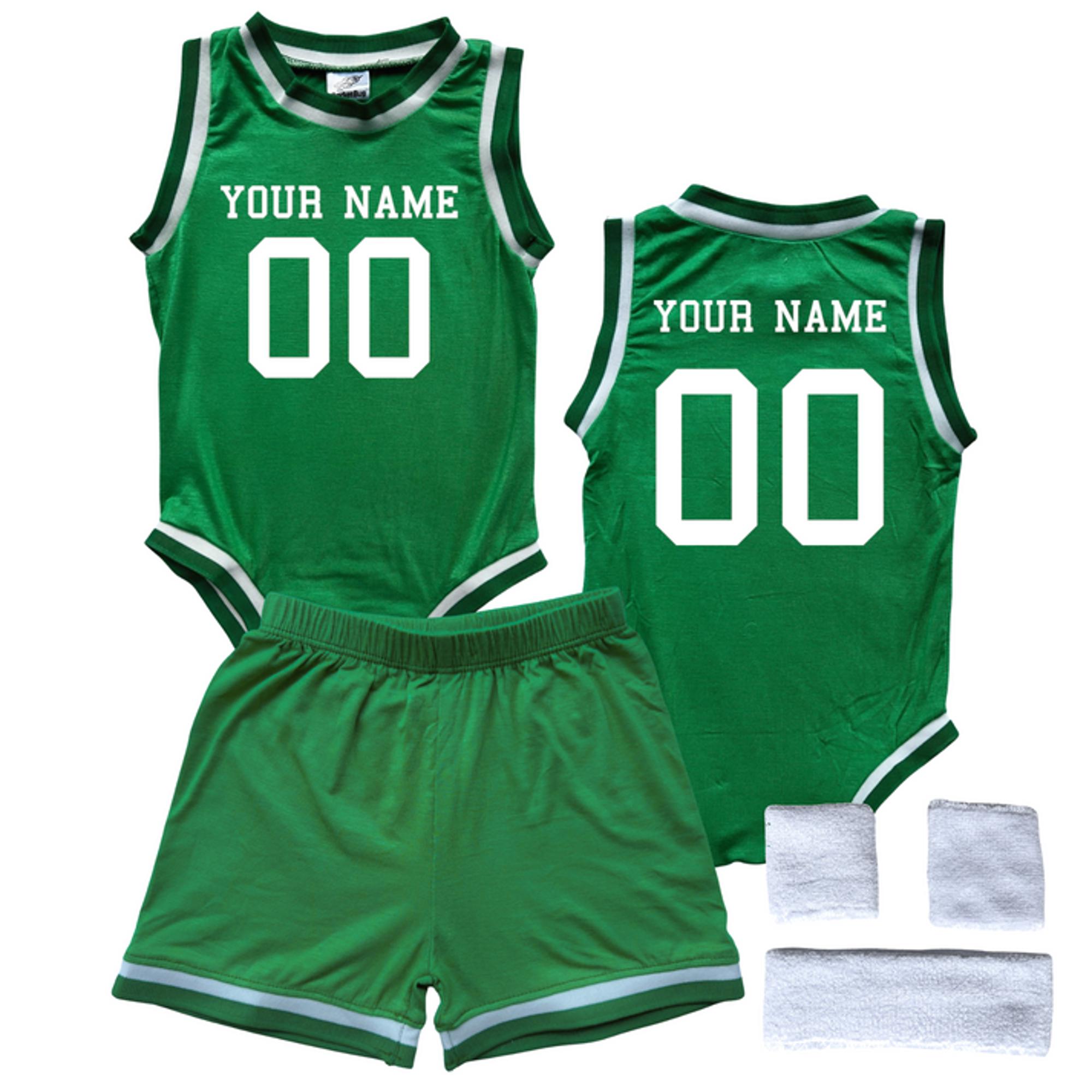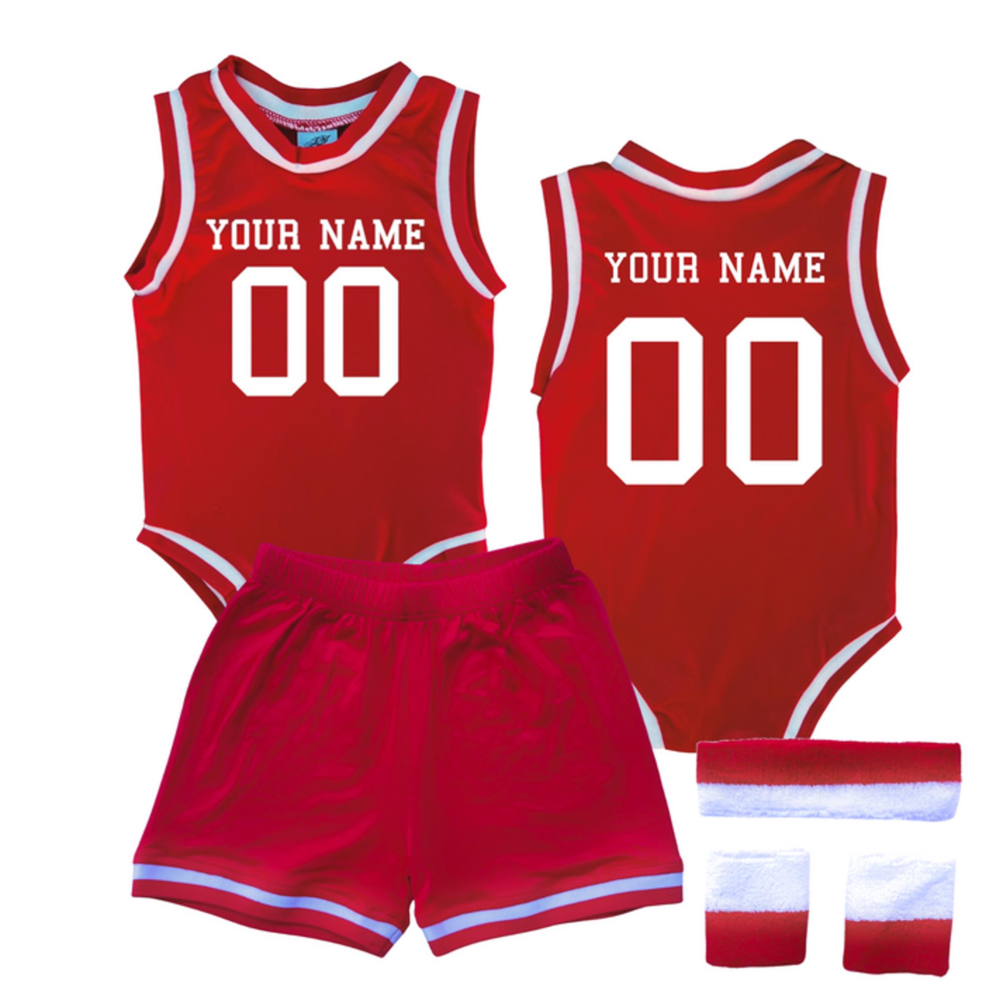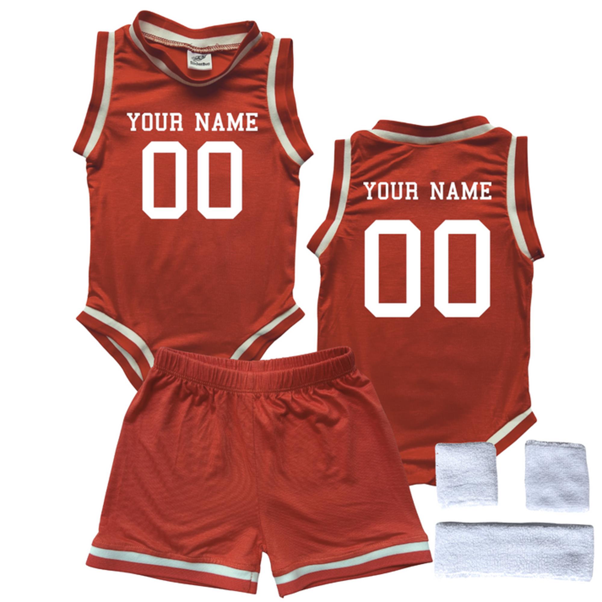 This personalized basketball jersey bodysuit with matching shorts makes a great gift for sports loving families! Babies can cheer on their favorite team, support basketball playing siblings, or celebrate birthdays in these eye-catching jerseys.