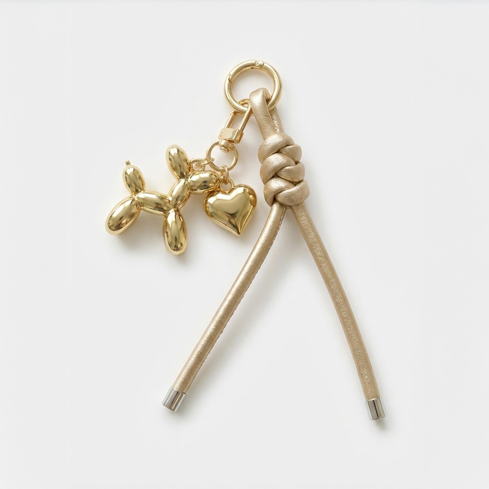 Design: Metallic balloon dog & heart charm with a stylish knotted rope loop.
