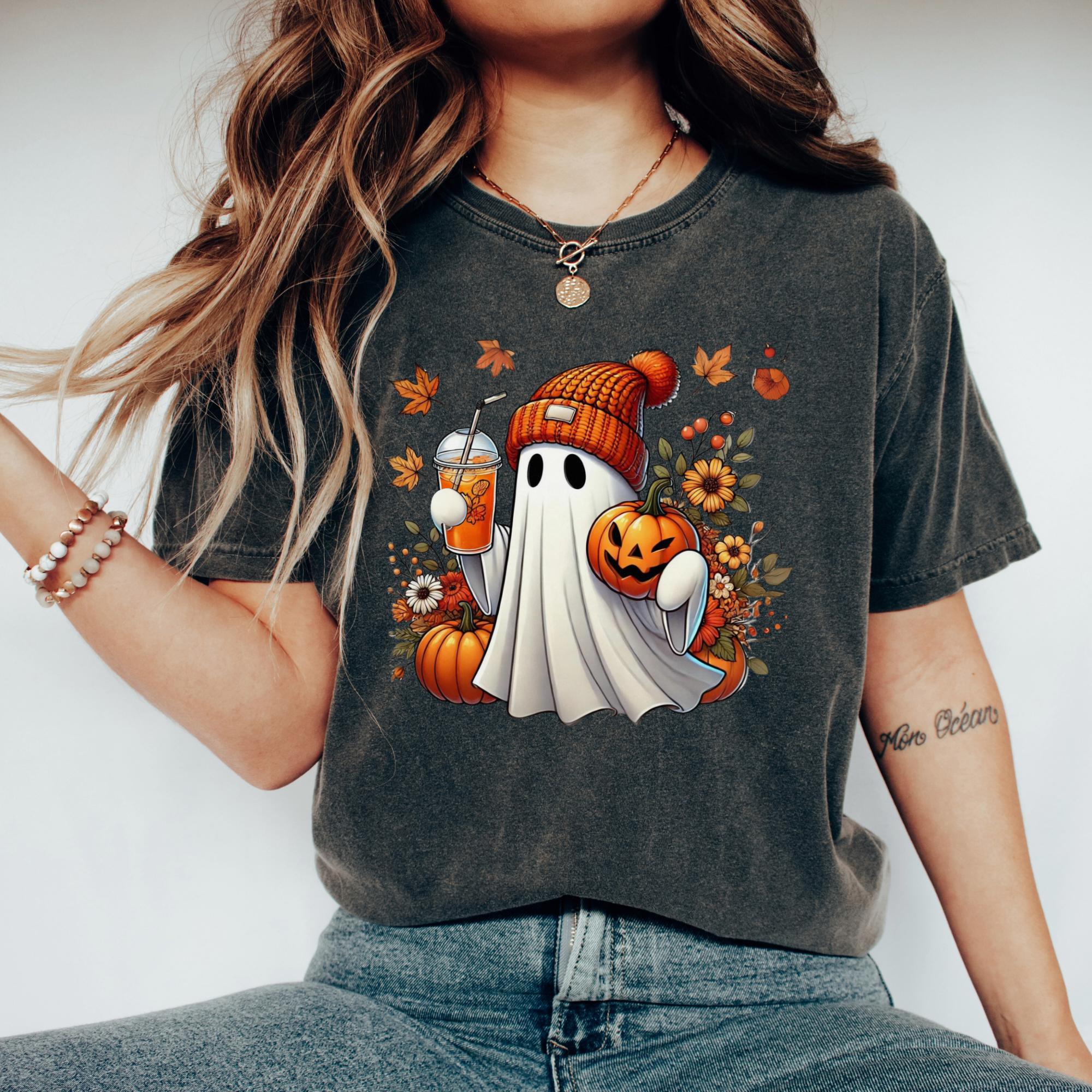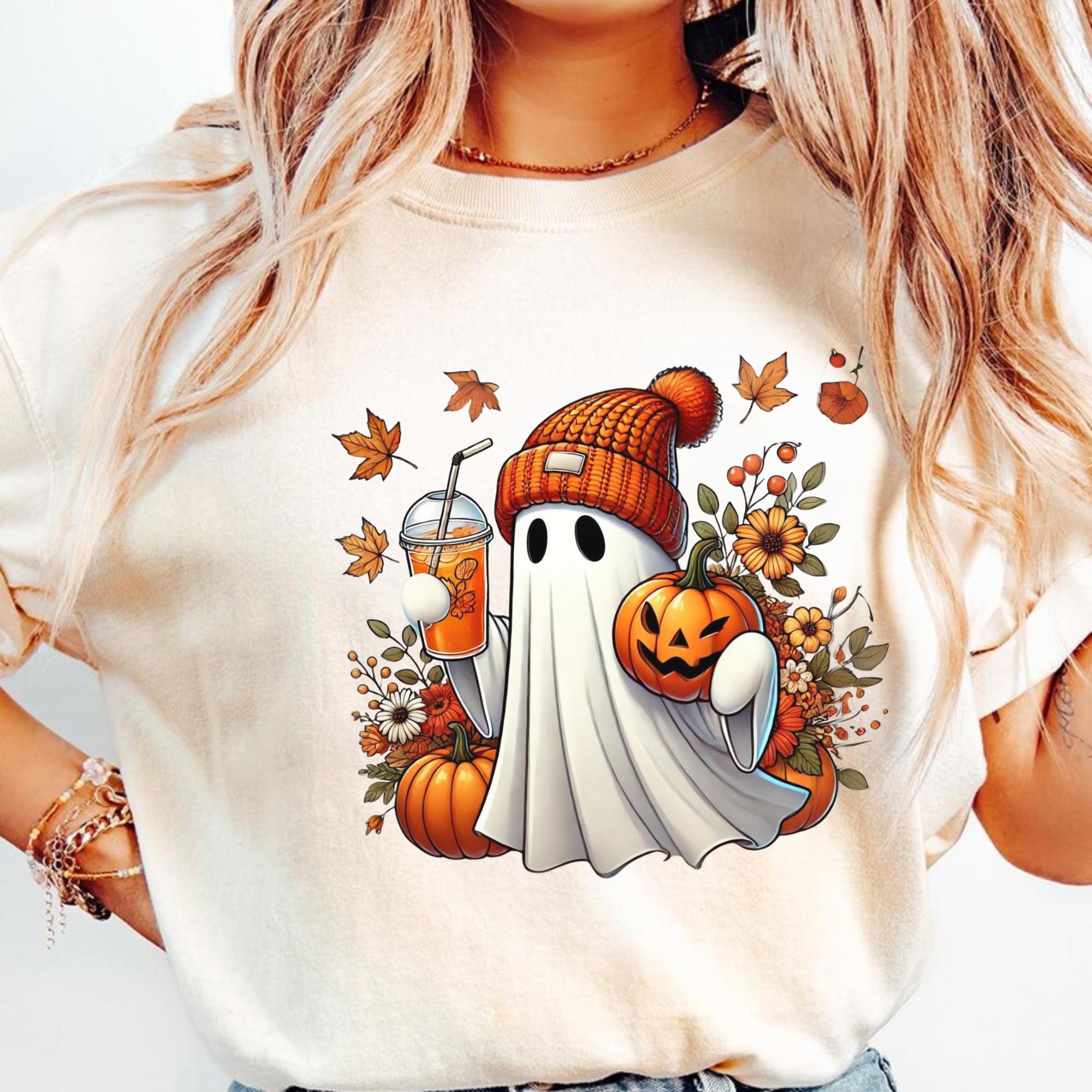 Fall Ghost Pumpkin Graphic Tee – Cozy Halloween Shirt with Autumn Leaves & Coffee, Cute Spooky Season Top, Pumpkin Patch Outfit, Gift for Her