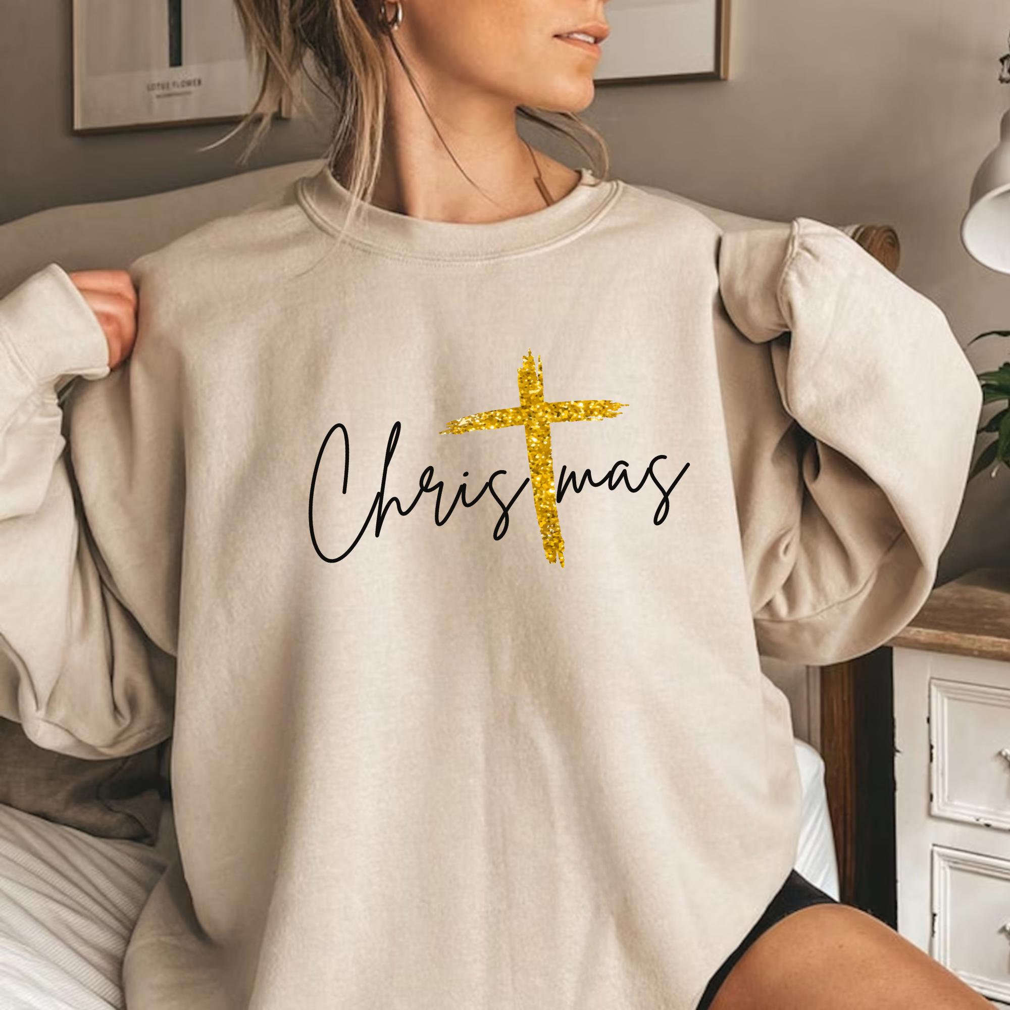 Gold Cross Christmas Sweatshirt, Faith-Based Holiday Crewneck, Christian Faux Glitter Cross Sweater, Elegant Jesus Christmas Shirt, Cozy Winter Top, Gift for Her