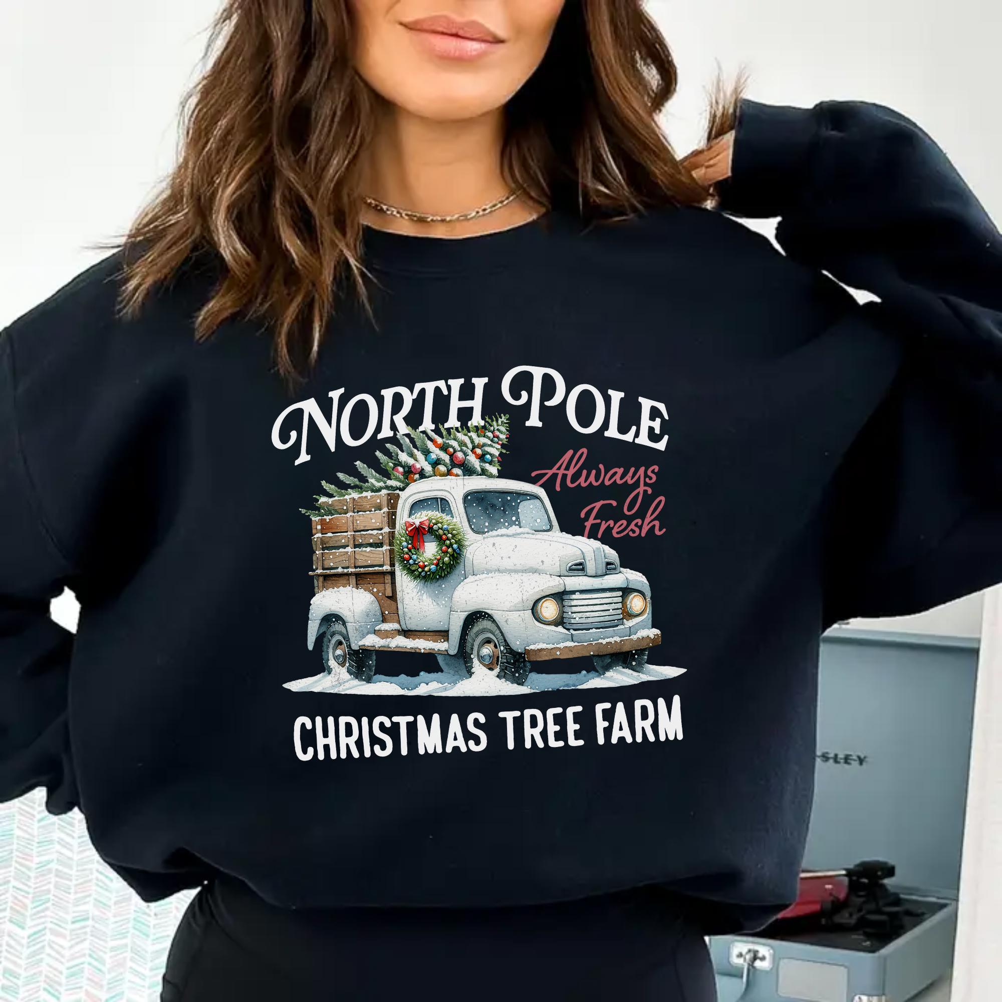 North Pole Christmas Tree Farm Sweatshirt – Vintage Holiday Truck Graphic, Cozy Winter Pullover, Merry Christmas Top, Gift for Her