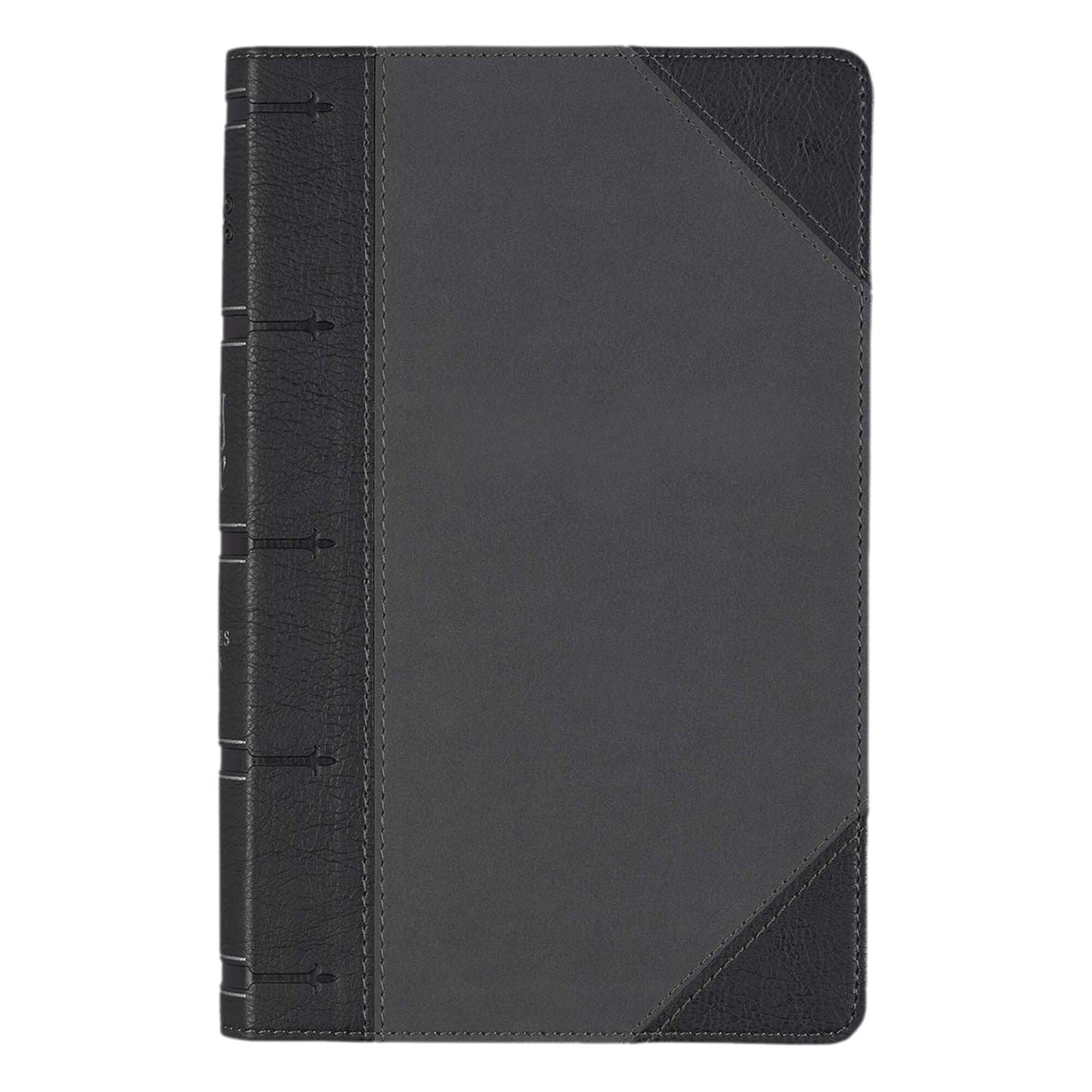 Bound in black and gray faux leather with a flexcover design, it features a lay-flat spine, silver gilt-edged pages, thumb index, double-column format, and 14-point giant print for easy reading. Additional features include a heat-debossed title, silver-foiled spine title, Words of Christ in red, thematic Scripture verse finder, one-year Bible reading plan, concordance, cross-referencing, 8 full-color maps, and a presentation page, making it a comprehensive and visually appealing King James Version Bible.
