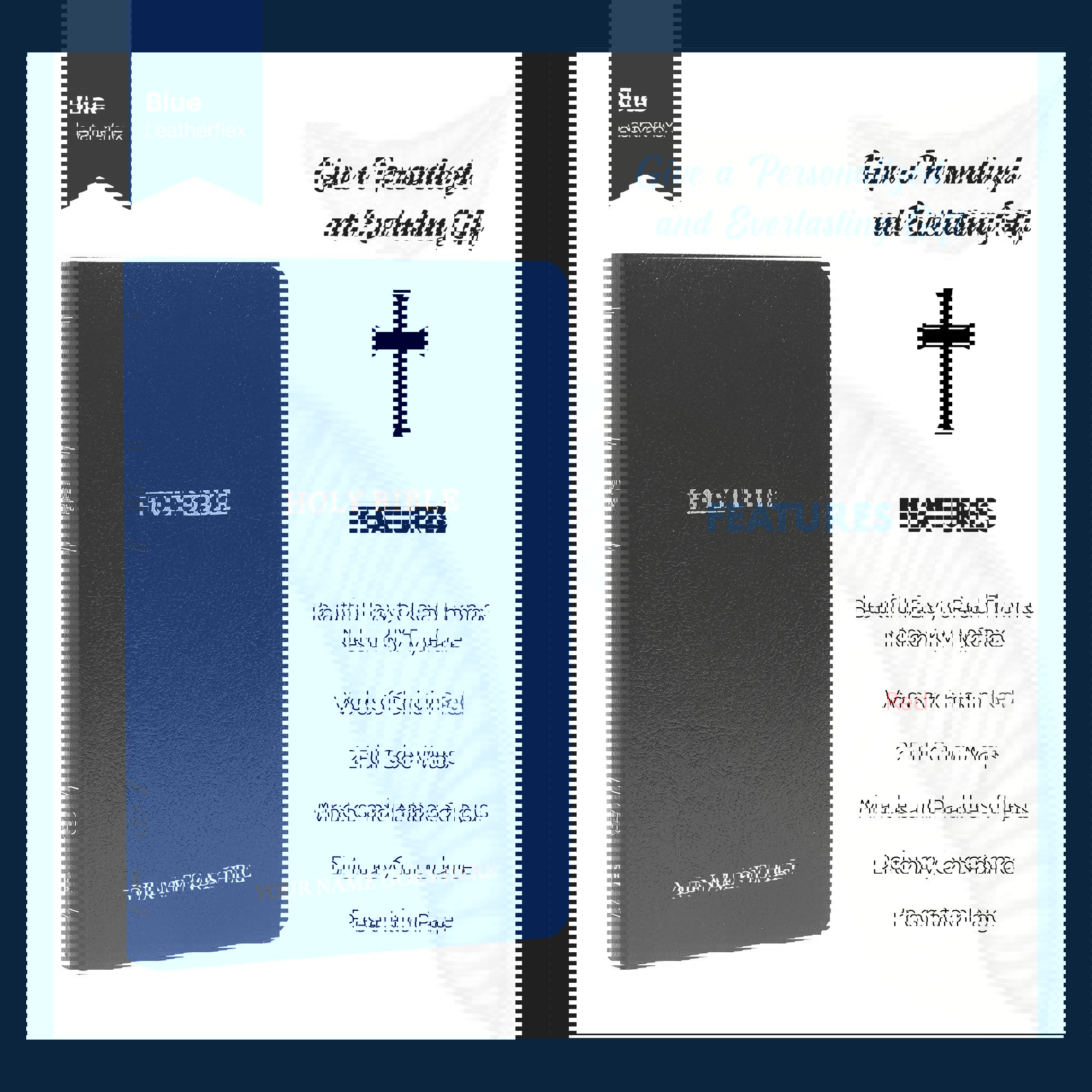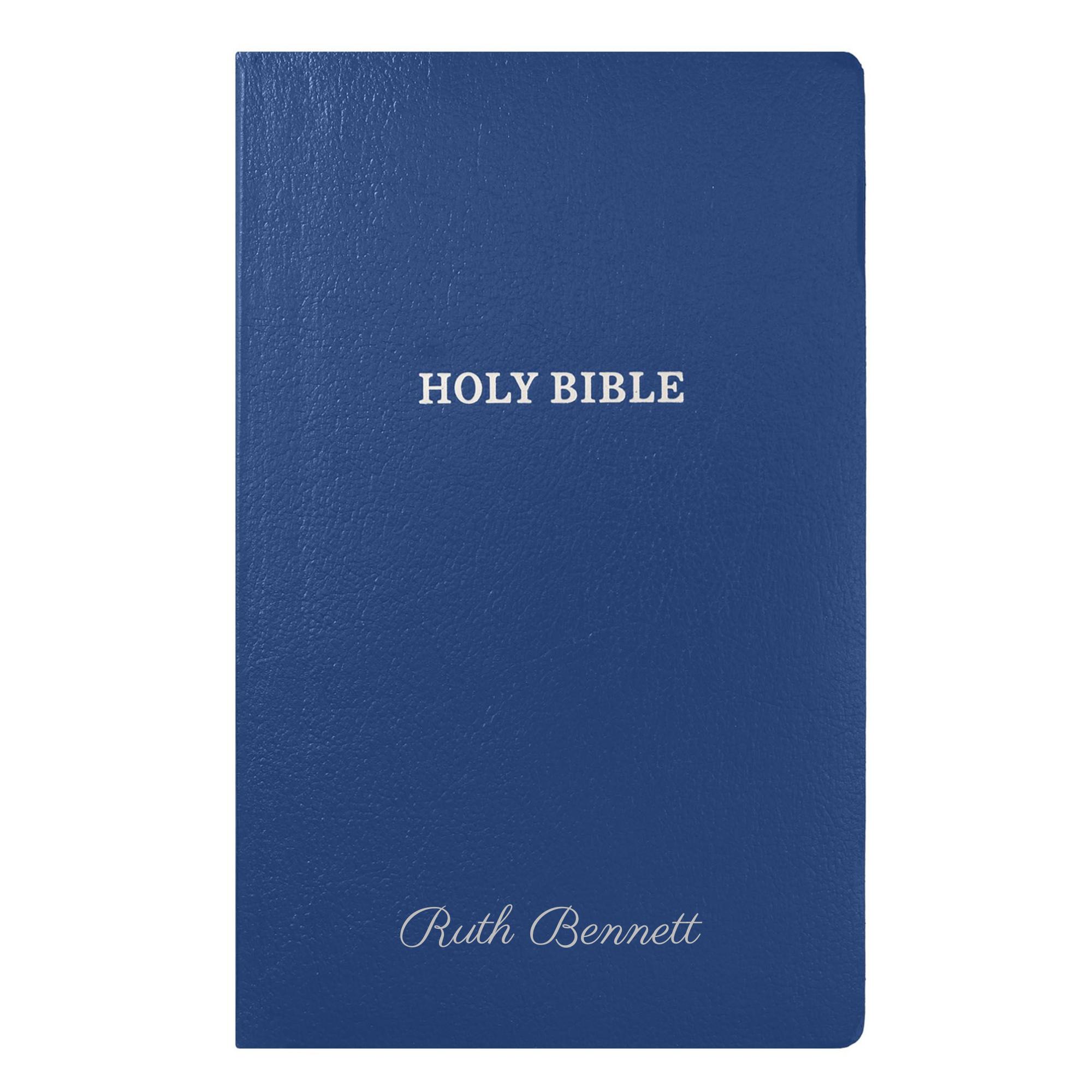 You can personalize this Bible with a name only, beautifully imprinted in silver on the blue faux leather cover.