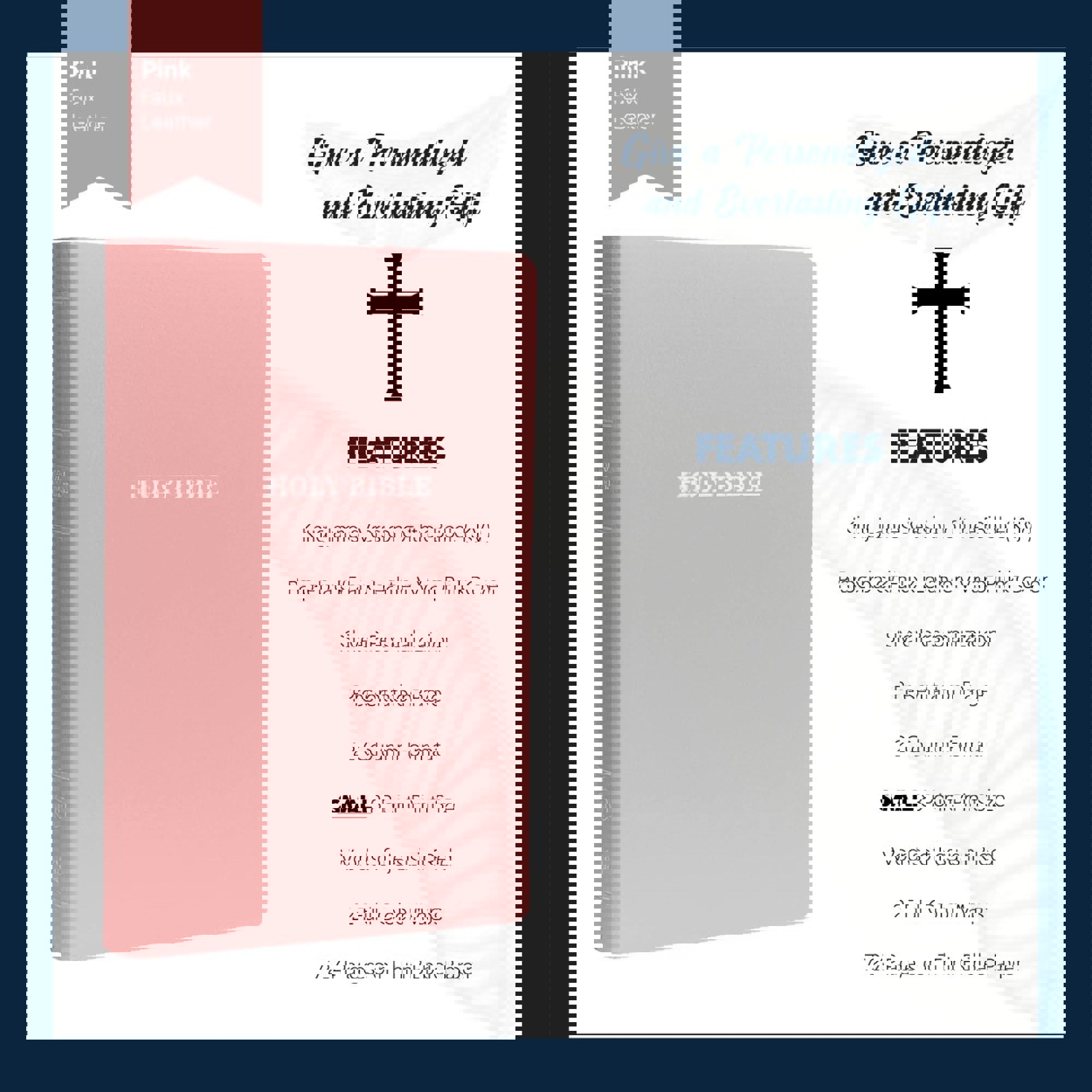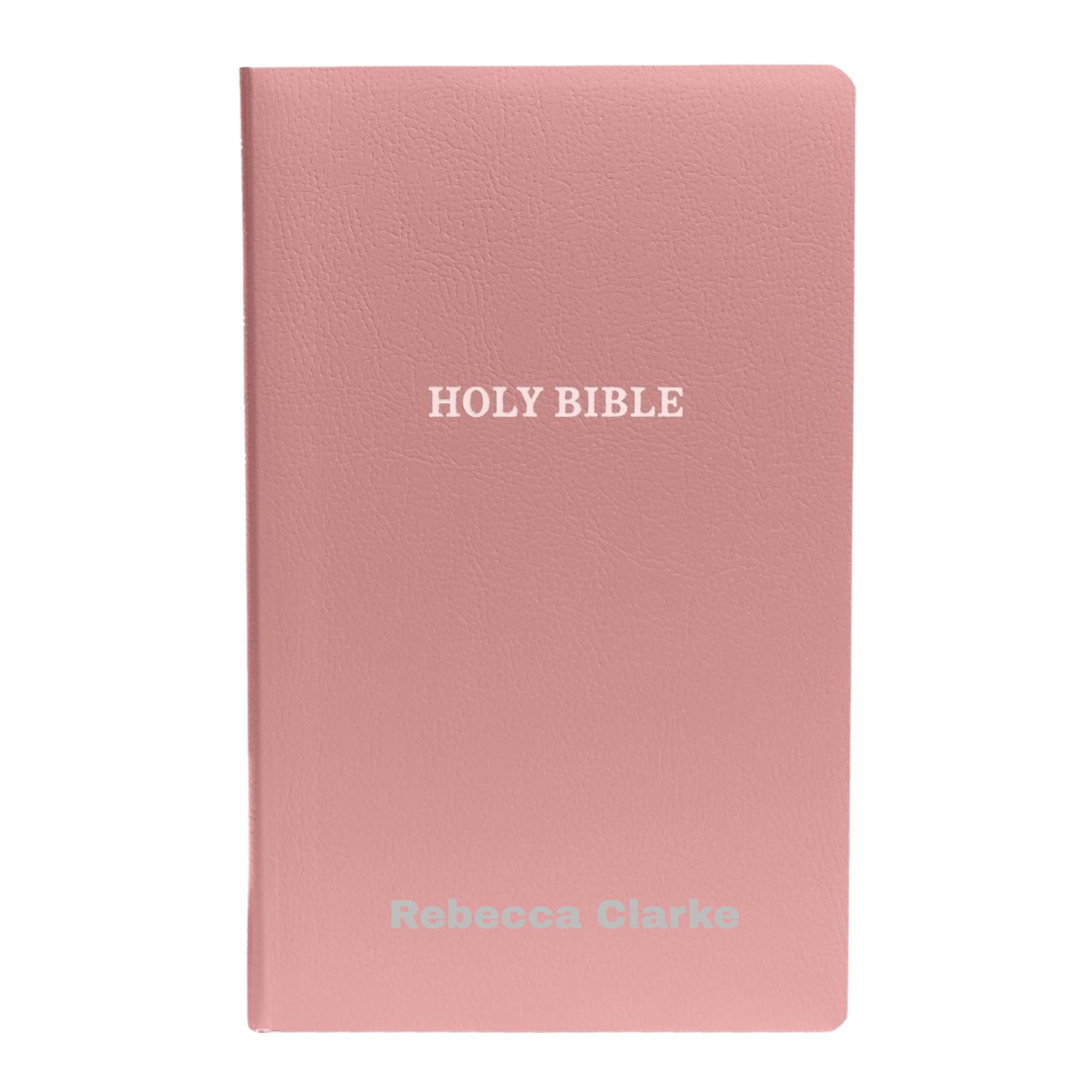 You can personalize this Bible with a name only, beautifully imprinted in silver on the pink faux leather cover.