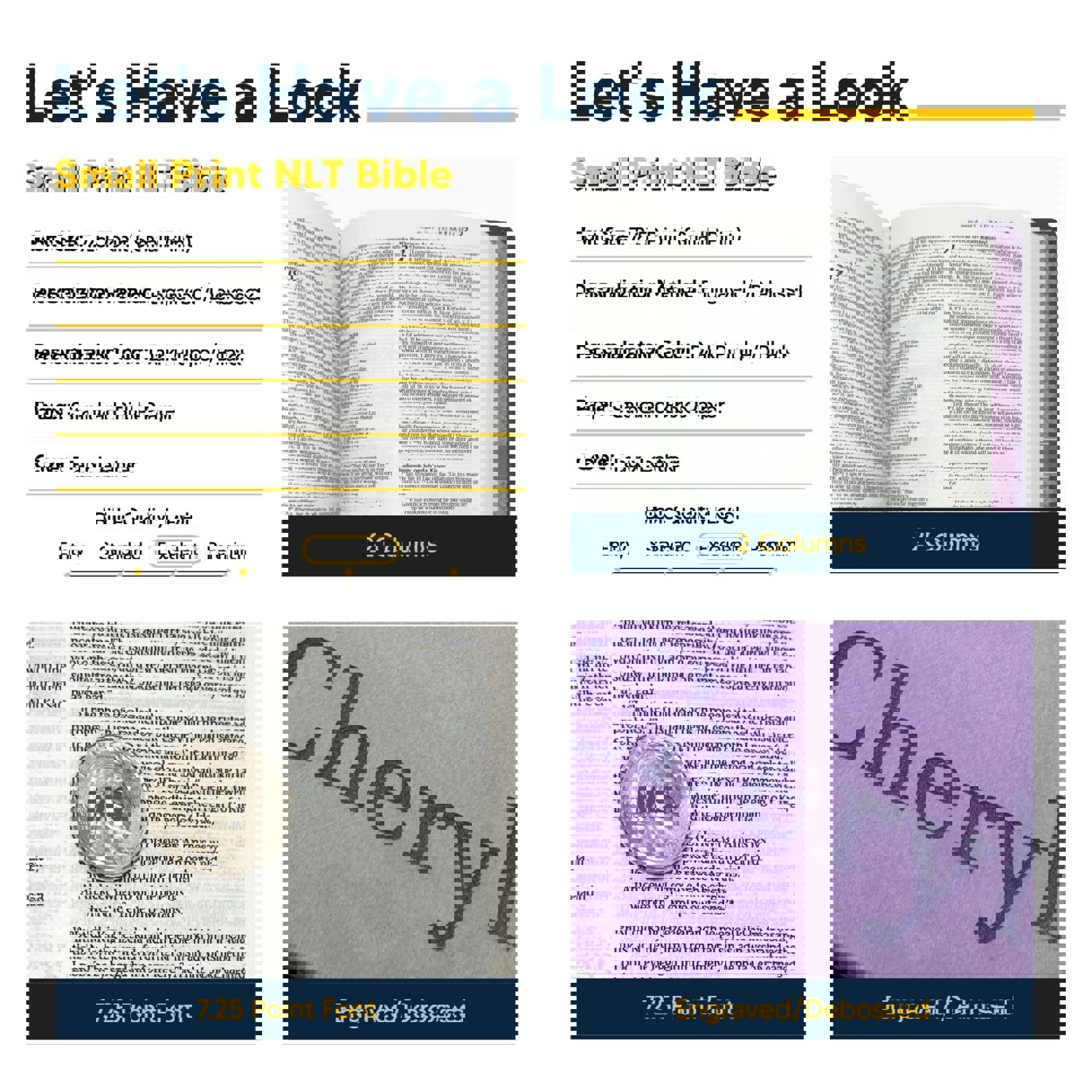 Cherish your faith journey with this�Purple NLT Bible, personalized with a name only (up to 7 characters) engraved in a rich dark purple/black color on the lower right-hand corner of the cover.