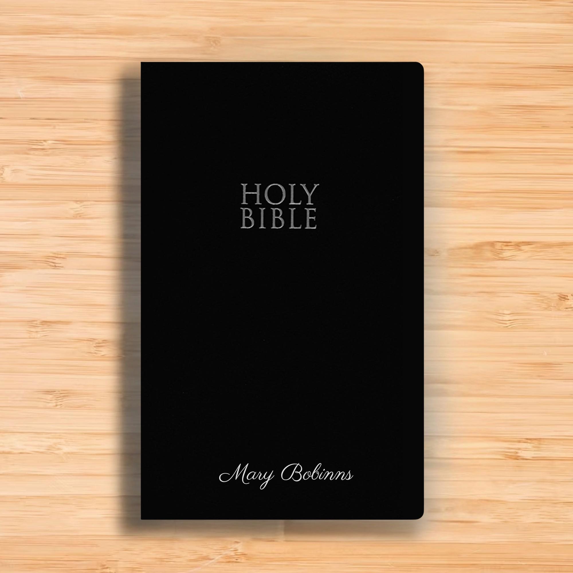 You can personalize this Bible with a name only, beautifully imprinted in silver on the black faux leather cover.