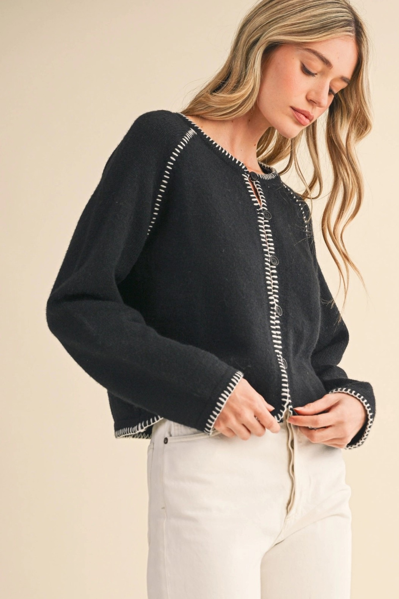 Leia Contrast Blanket Stitch Sweater Cardigan | Women's Black Soft Warm Knit Button-Up Top | Fall and Winter Fashion