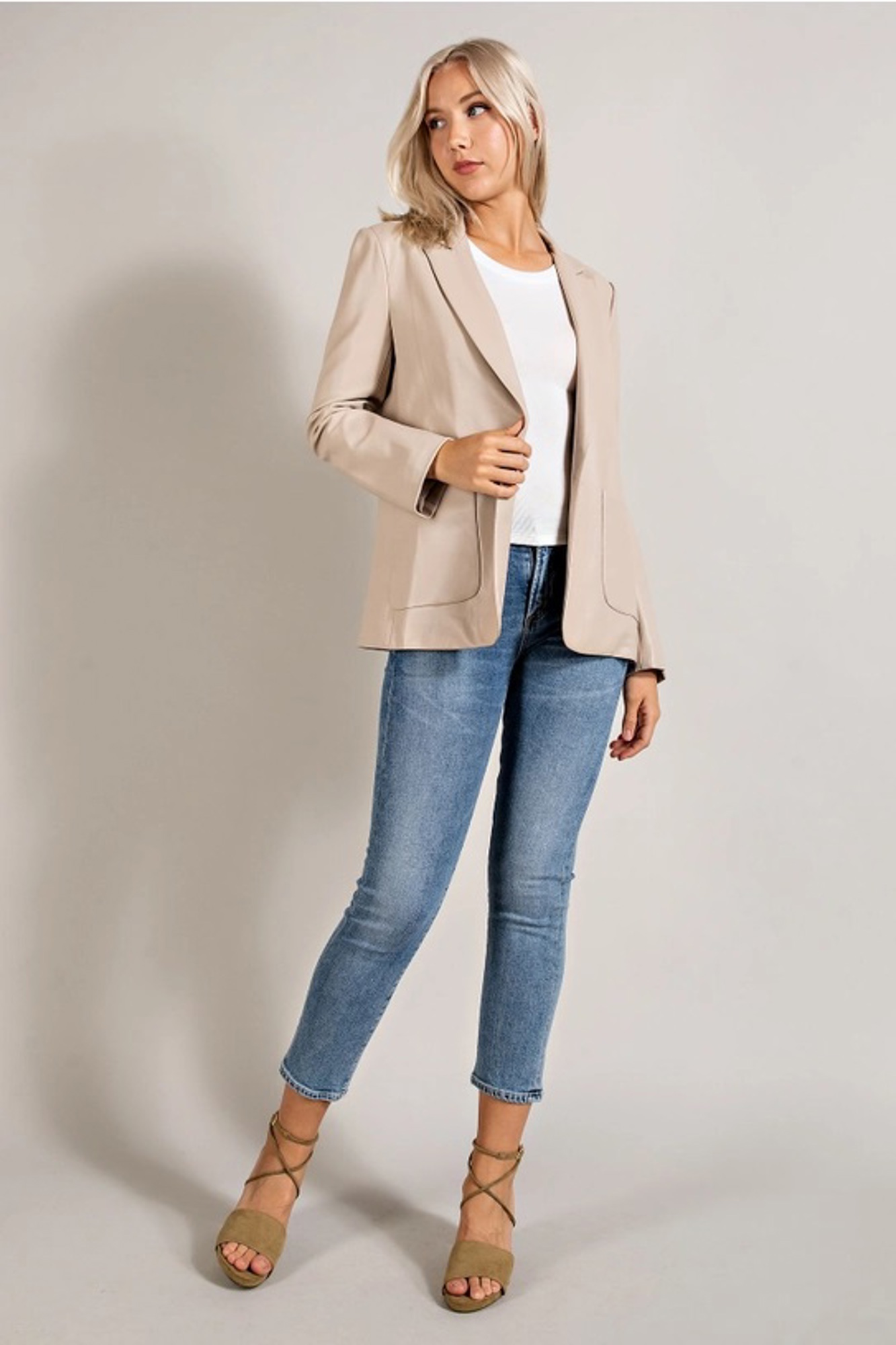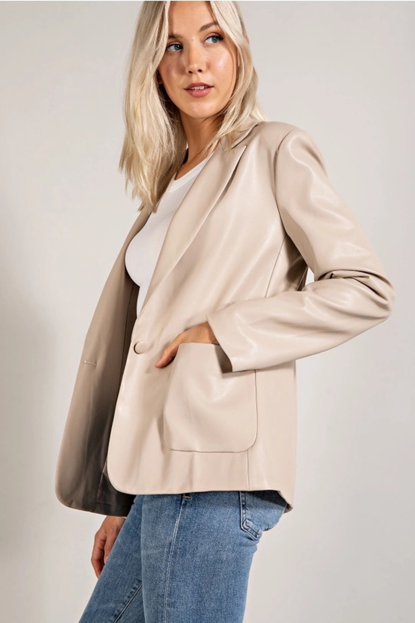 Monet Faux Leather Blazer | Women's Beige Jacket | Fall and Winter Trendy Style | Neutral Fashion | Collared Single-Breasted | Flap Pockets | Long Sleeves