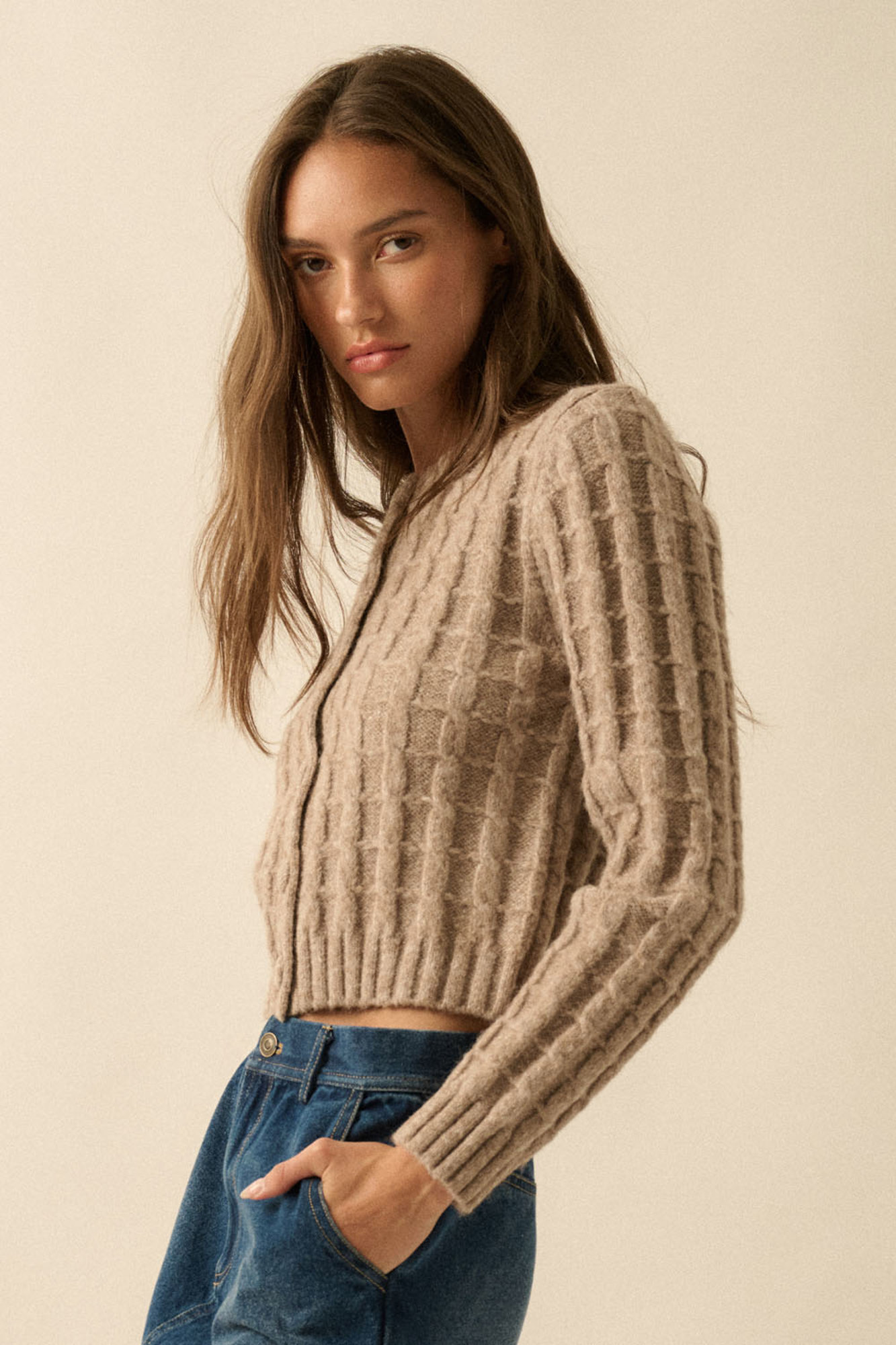 Naomi Cable Knit Button-Up Cardigan Sweater | Women's Fall and Trendy Style | Long Sleeves | Neutral | Beige | Layers