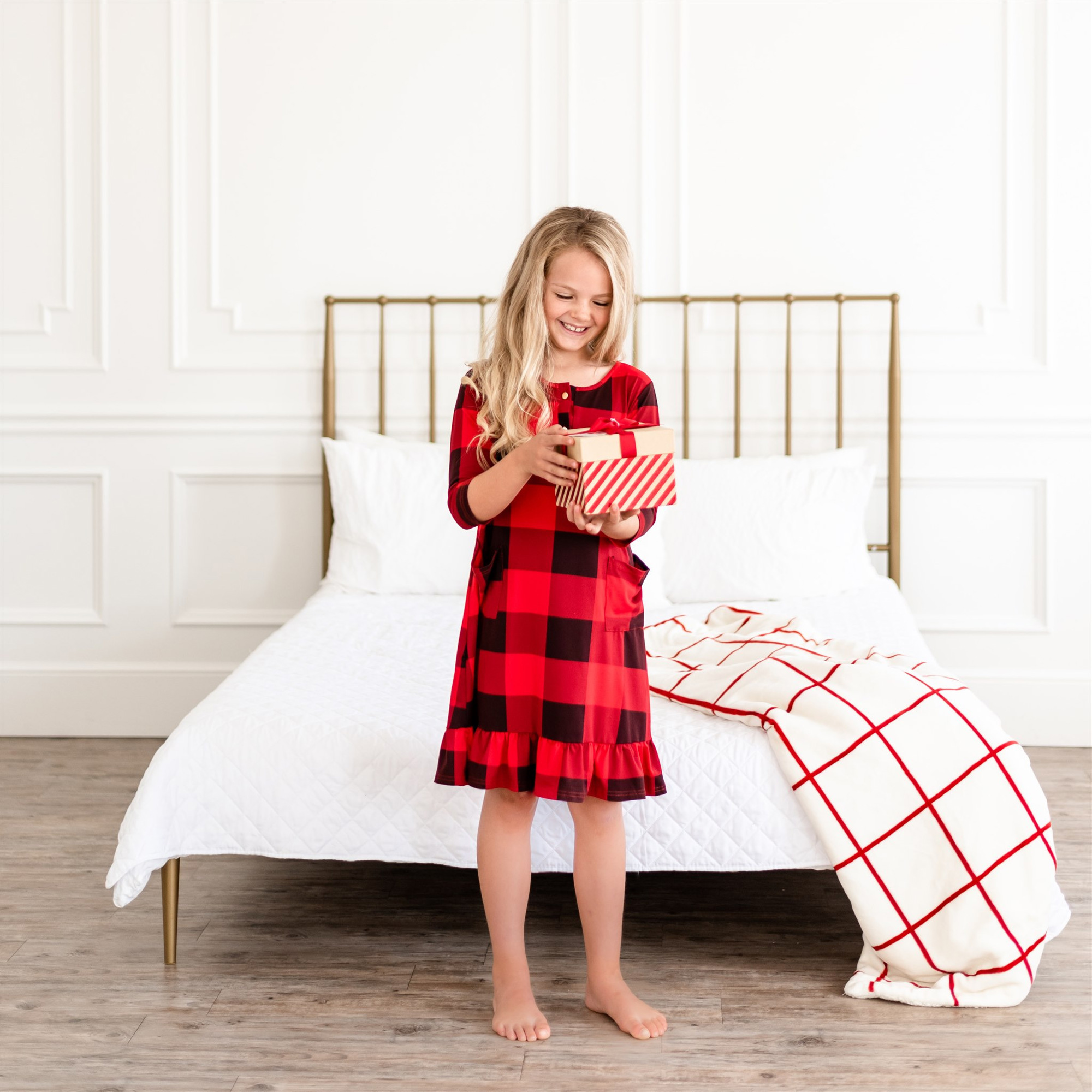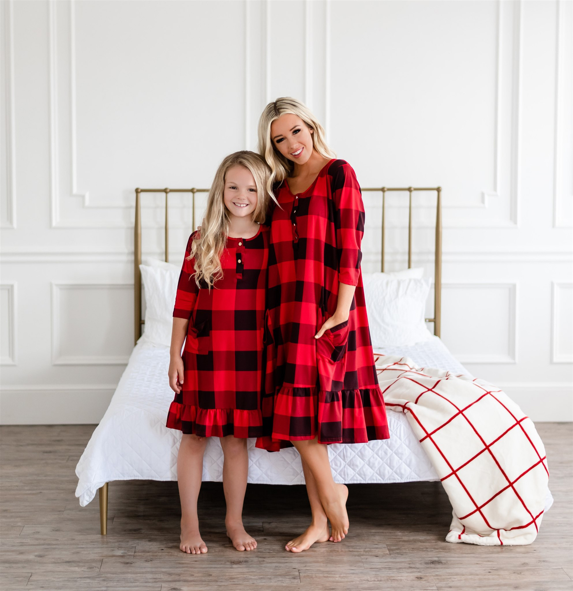 We are so excited about our Mommy and Me Holiday House Dresses! Christmas is going to feel extra comfy this year! House dresses are all the rage, and it's no wonder why! Who wouldn't want to feel like she's in her PJ's all day while still looking fabulous? Our holiday house dresses feature a loose, 3/4-sleeve, exposed pockets, a ruffled hem, and beautiful brass buttons, making them nursing friendly. Fabric is ultra soft and lightweight.