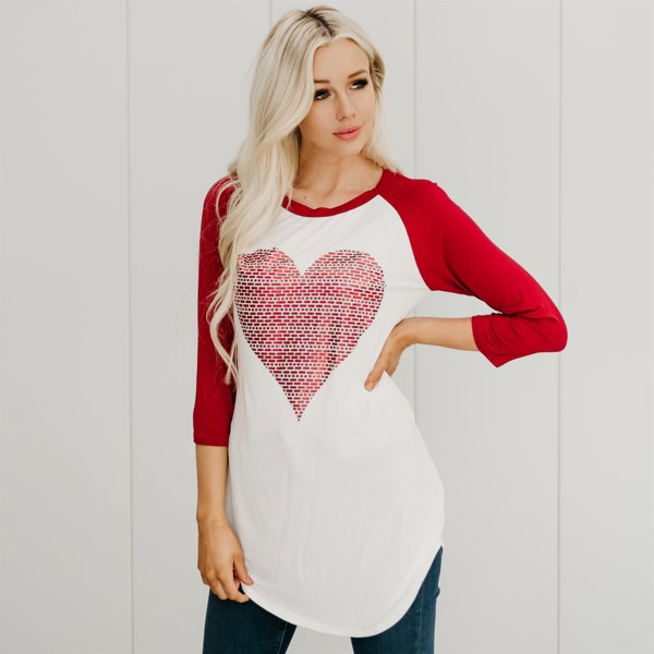 This is a great shirt! However, the large was not only bigger than a large but longer. I would estimate that it was about 4-5 inches longer than this exact style shirt that I bought from another vendor. Also, the material does not feel like cotton. It has more of a polyester texture but very soft and well made. The metallic heart is a little rubbery feeling but looks very elegant. It does cling to the chest a little which emphasizes the breast! Ha! Ha!