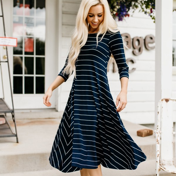 The dress is SUPER cute and true to size but I have large boobs and when it stretches the navy material turns white. Other than that the dress is great!