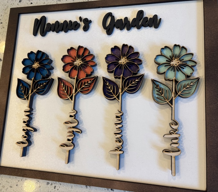 This wooden art can be completely personalized. Sizes will vary based on number of flowers. A rough estimate of sizes for 3 flowers is 10" tall x 8" wide. Up to 7 flowers would be 12.5" wide x 10" tall.
