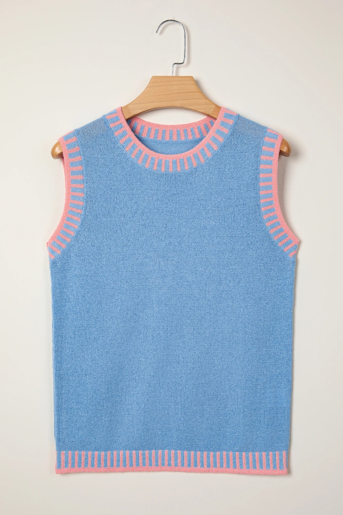 The contrast trim design adds a pop of color to this lightweight knit top. A chic sleeveless sweater ideal for work, travel, or casual outfits.