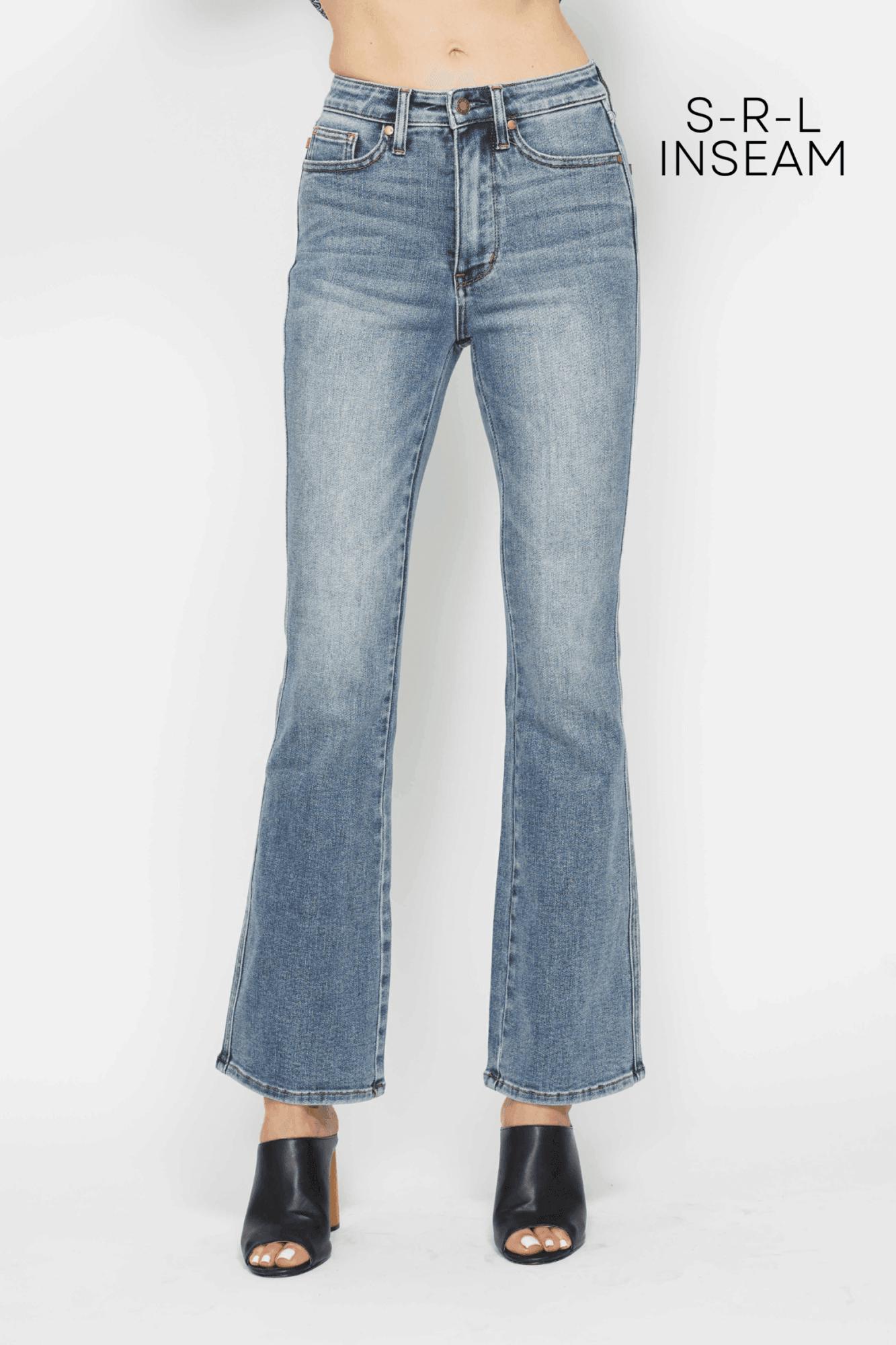 Judy Blue High Waist Tummy Control Back Pocket Embroidery Denim Jeans 88783 - 3 Inseam Options: Short, Regular, Long Style #JB88783 Bootcut fit: cut to flare out slightly at the ankle Material: 76.2% Cotton, 22.5% Polyester, 1.3% Spandex Regular sizes 0(24) to 15(32) Short Inseam: 30” Regular Inseam: 32" Long Inseam: 34" Front Rise: 11” Model Info: Wearing a Judy Blue Size: 1 Height: 5'9 Waist: 24" Hips: 34" Plus sizes 14W to 24W Short Inseam: 30” Regular Inseam: 32" Long Inseam: 34" Front Rise: 12” Model Info: Wearing a Judy Blue Size: 14W Height: 5'9 Waist: 37" Hip: 48" Measured on the smallest size and may vary by size. Sizing Recommendation: Judy Blue jeans are very stretchy and run generous compared to other brands. We recommend sizing down one from your normal non-Judy Blue jean size. Contact us for any additional measurements or sizing. Front rise determines how high your pants sit around your waist. The front rise is measured from the crotch seam straight up to the top of the waistband. The height is also referred to as low, mid and high rise. Inseam determines how long your pant length is to the ground. The inseam is measured from the crotch seam straight down to the bottom of the hem. Hems can be shortened with alterations. Denim Care: To encourage the quality of life, turn inside out and wash in cold water. Do not mix light and dark washes. Air dry or tumble on low. Judy Blue sizing is size/waist measurement, not size/inseam.