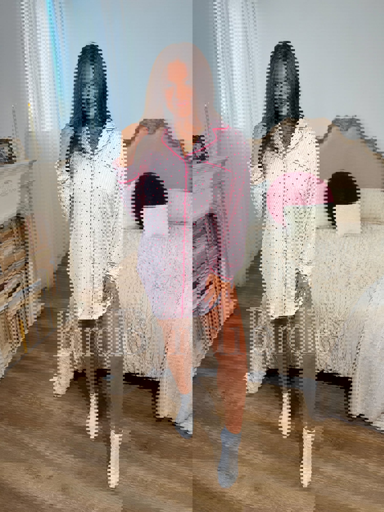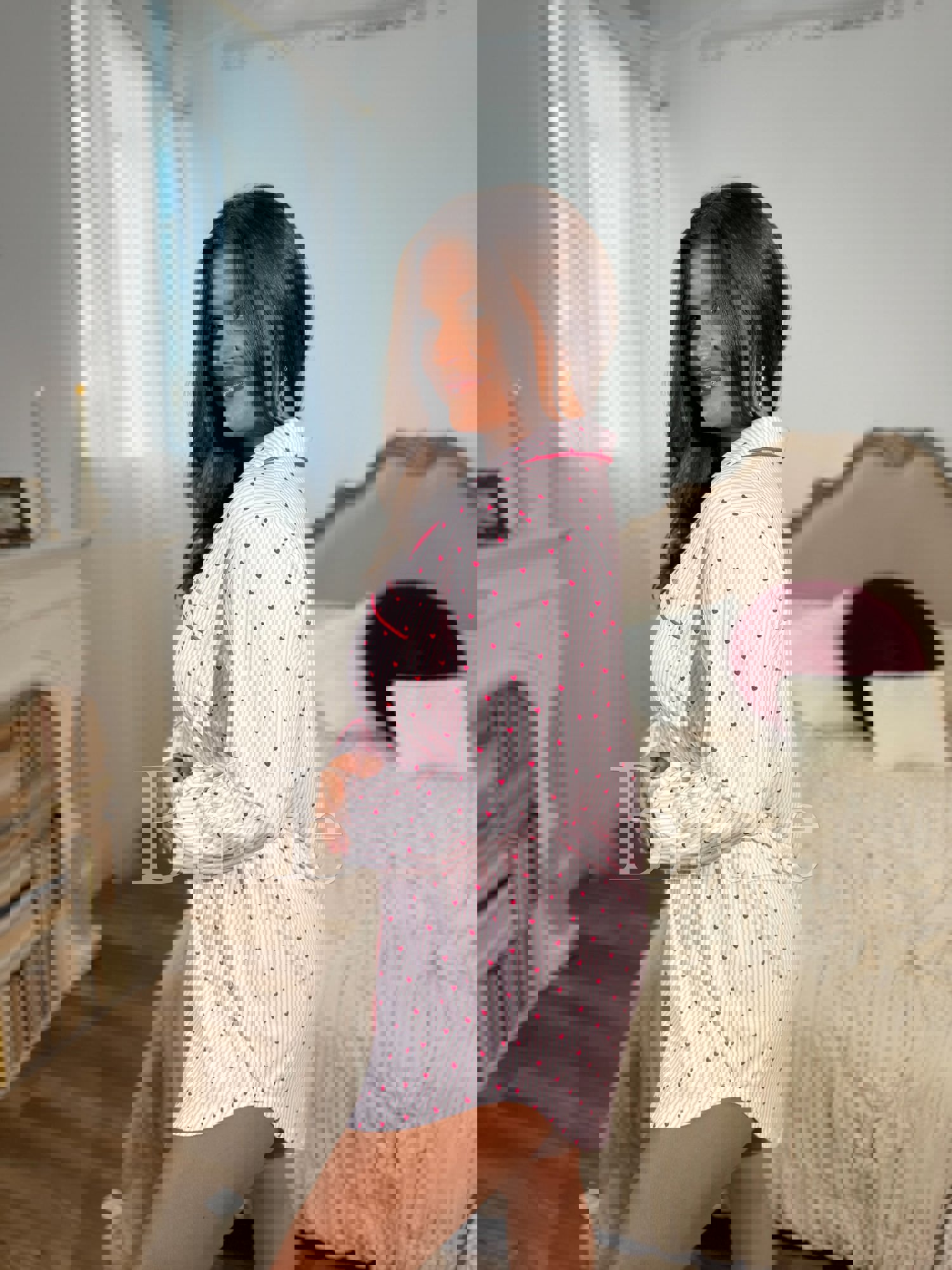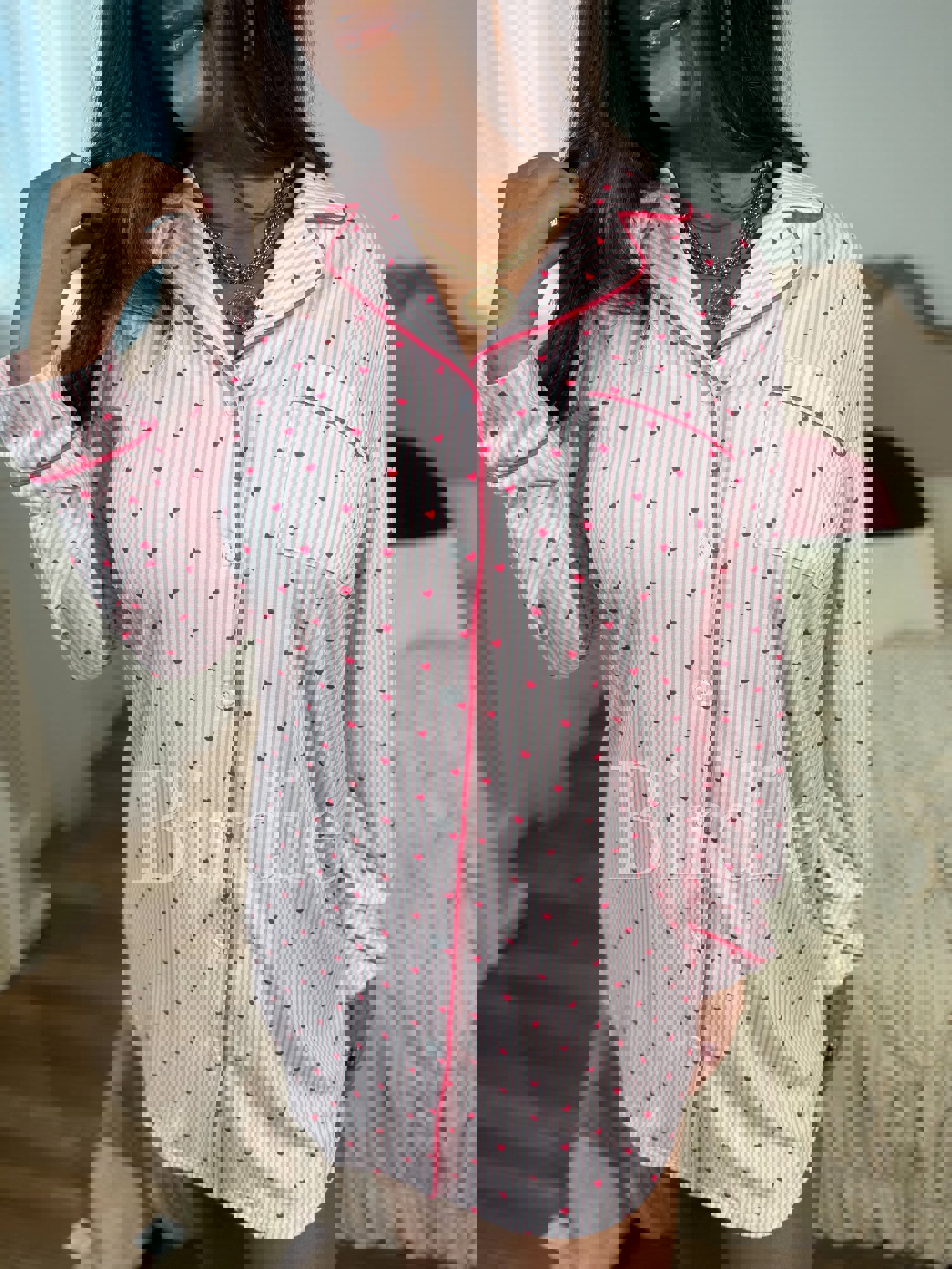 Fall asleep in style with our Light Pink Pinstripe Heart Sleep Dress — where classic meets cute. Featuring a soft pink pinstripe design sprinkled with sweet little hearts, this sleep shirt brings a playful twist to timeless sleepwear. Made from a silky-soft blend of 95% polyester and 5% spandex, it’s lightweight, stret
