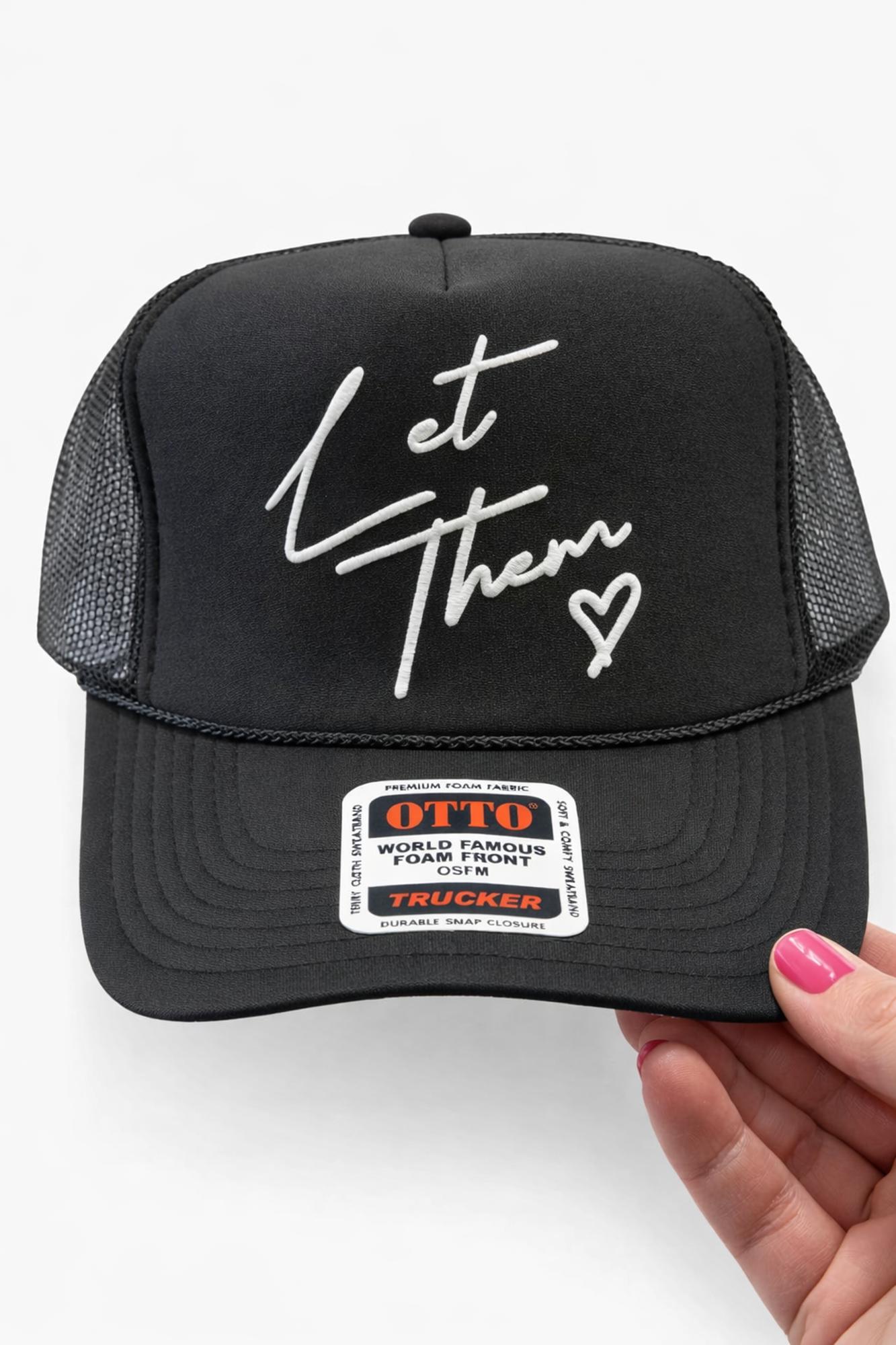 Simple words. Big energy. This black foam trucker hat features the minimalist yet powerful "Let Them" graphic—a quiet reminder to stay unbothered and let the noise roll off. With a structured foam front, breathable mesh back, and adjustable snap closure, it's built for comfort and confidence. This cap is your go-to for