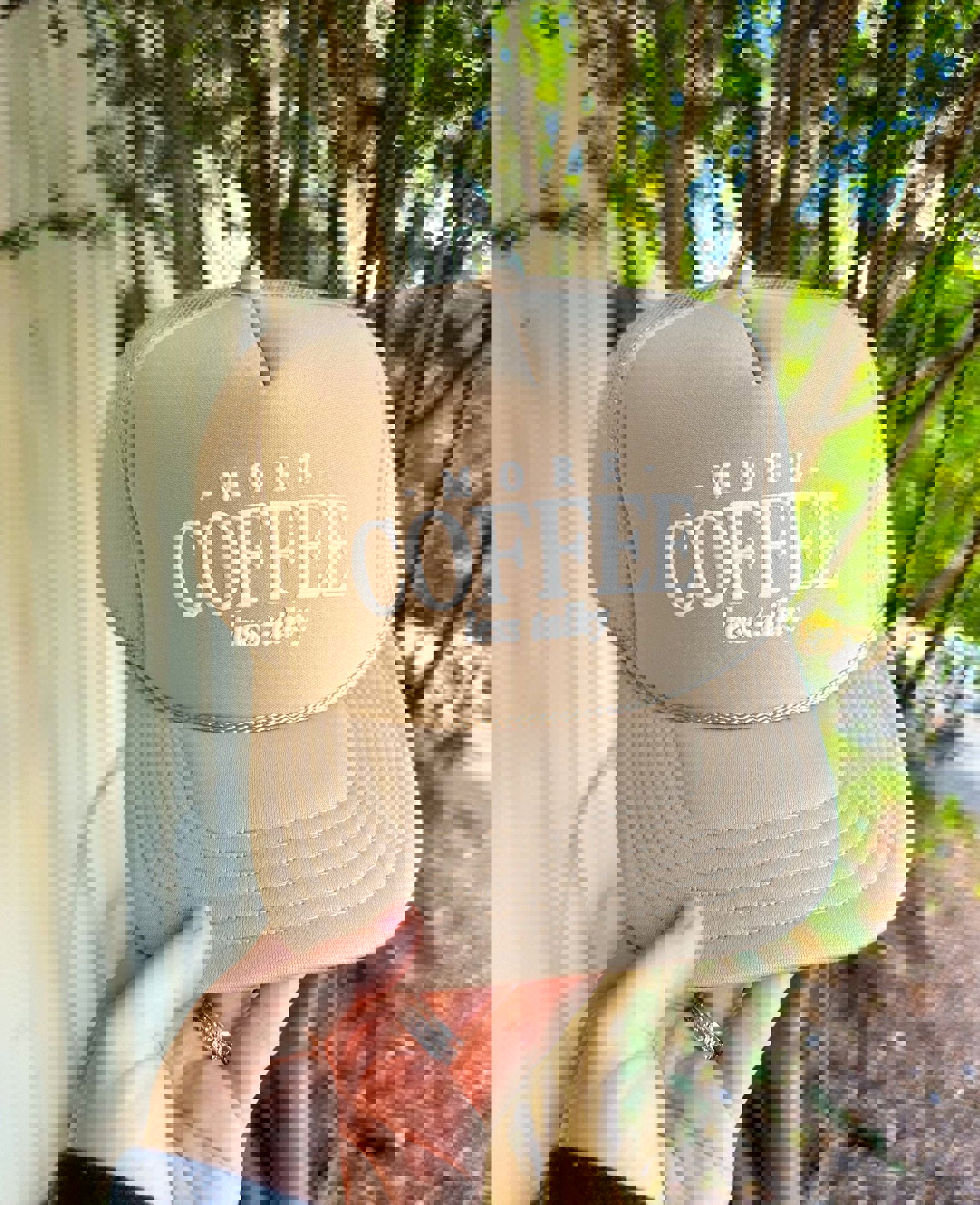 Southern Bliss More Coffee Less Talky Foam Lettering Khaki Otto Trucker Hat
