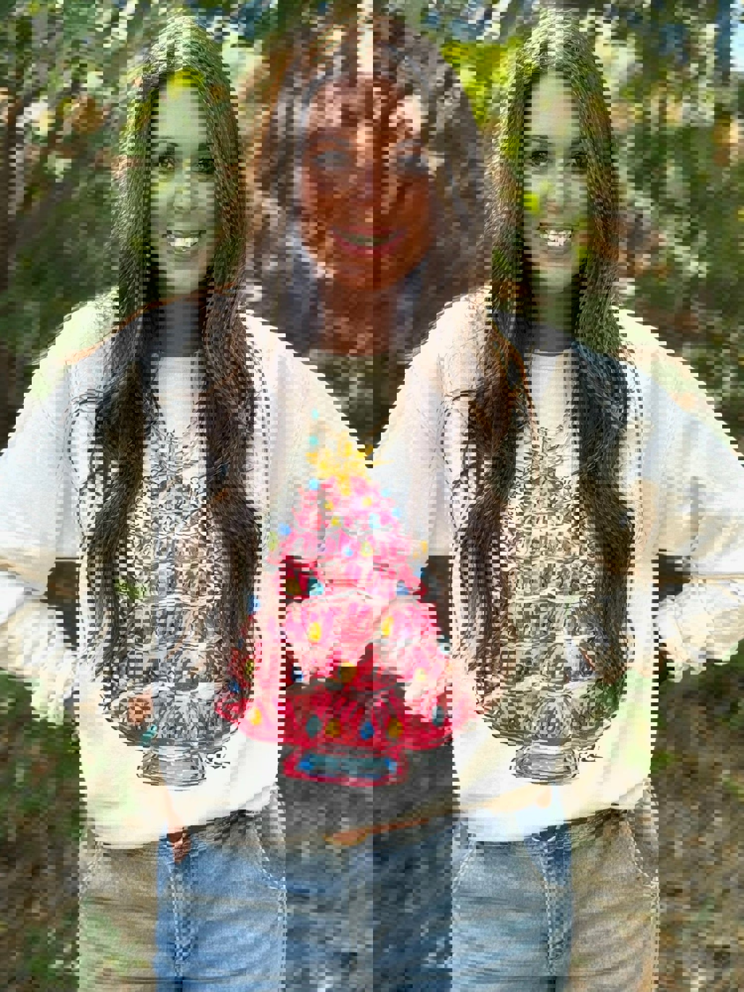 Rock around the Christmas tree in style with this hand-painted Pink Christmas Tree design by Callie Ann Stelter!Bright, festive, and oh-so-fun — this design has quickly become one of our best sellers this season. The soft pink tones and whimsical brushstroke style bring a fresh, cheerful twist to your holiday wardrobe.