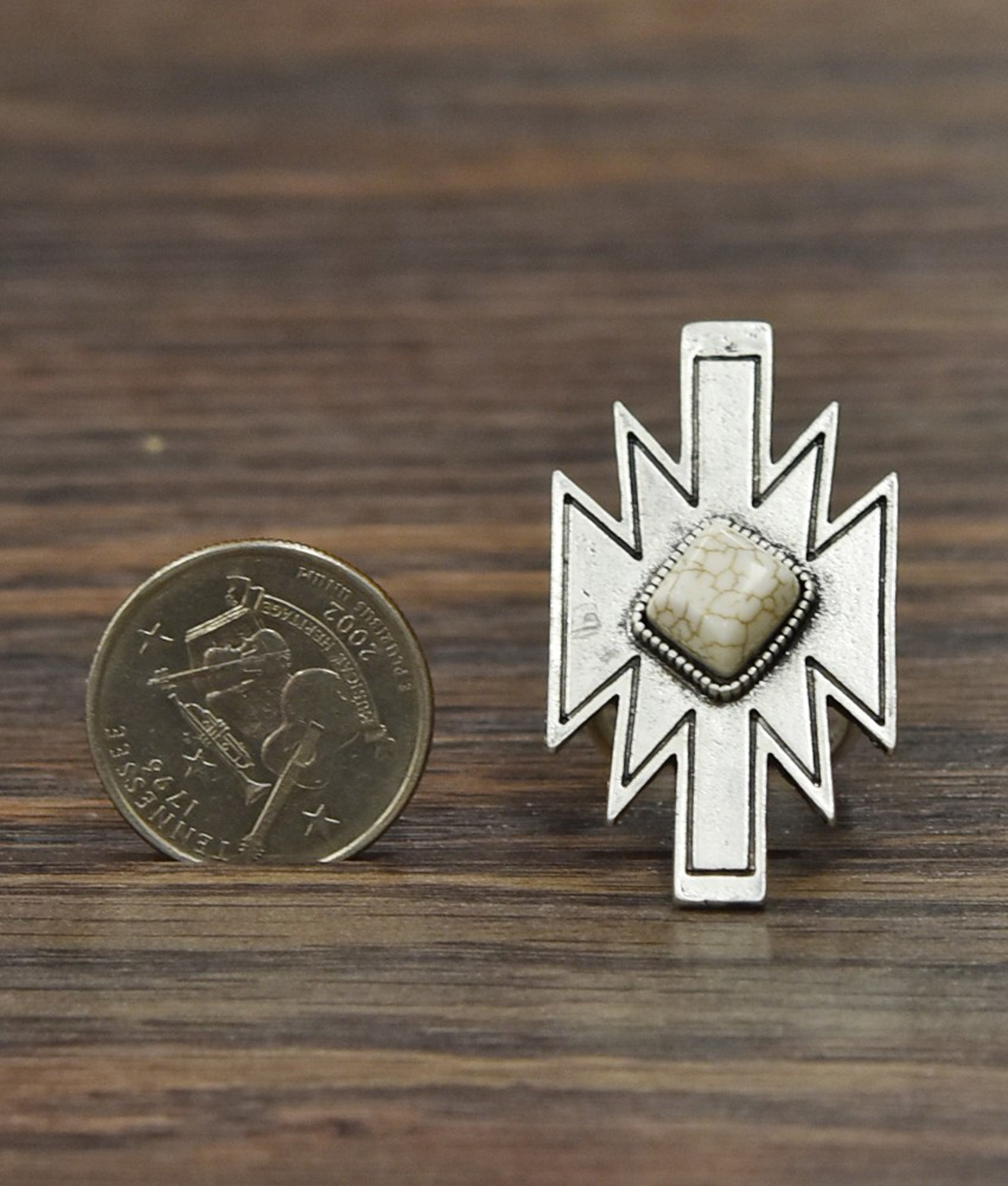 The Skinny: 1.8" Long, Aztec White Turquoise Ring, Brass Dual Adjustable Band * Natural stone may vary in size, color, or shape * One size, Adjustable size by pulling/pushing brass dual band * 1.8" long * White turquoise on alloy metal, antique silver plate * 12 grams weight * Nickel, Lead and Chrome free