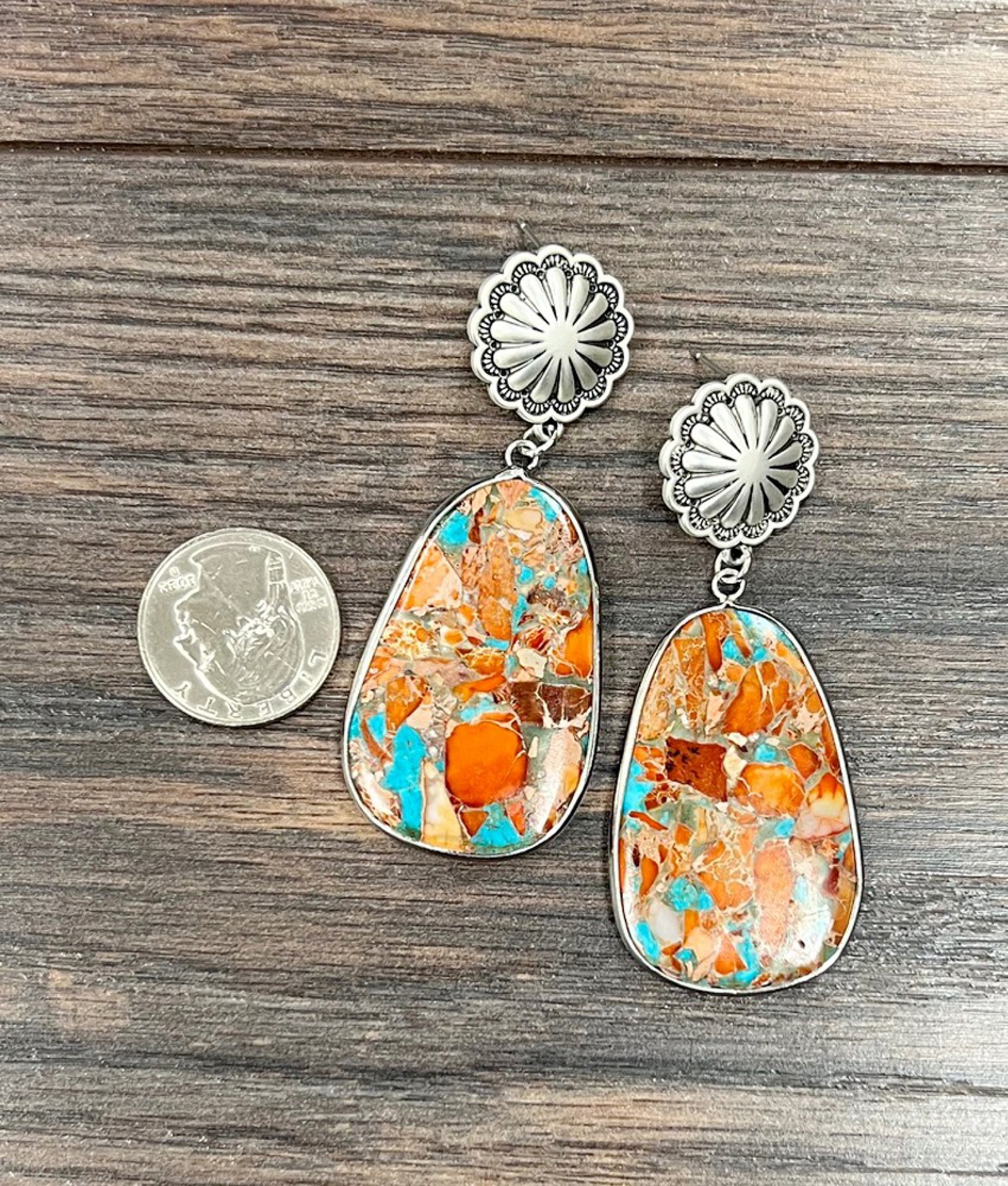 The Skinny: Sassy 3" Long, Bezel Setting Gemstone, Brass Post Earrings * Natural stone may vary in size, color, or shape * 3" long brass concho post earrings * Each earring 11 grams in weight * Nickel, Lead and Chrome free