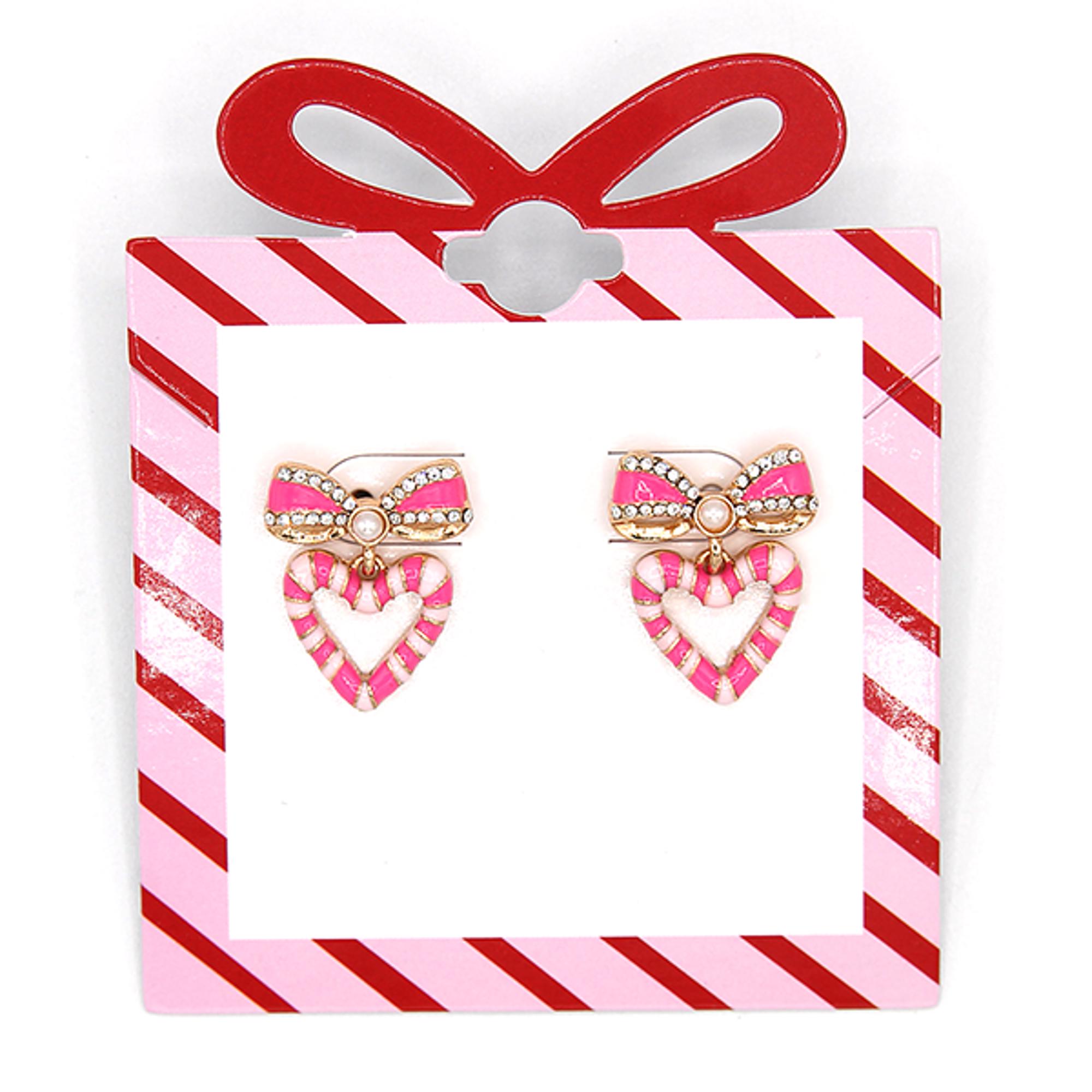 Candy Cane Heart Bow Bling Stud Earrings - PINK and Bling colors
