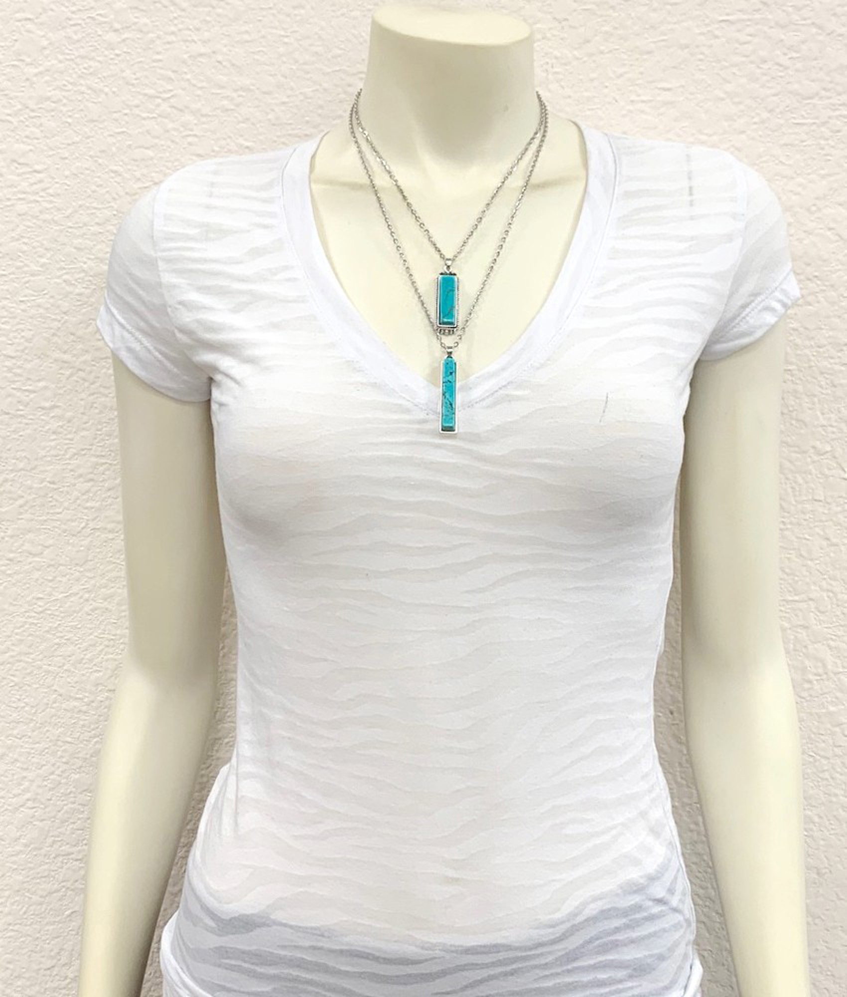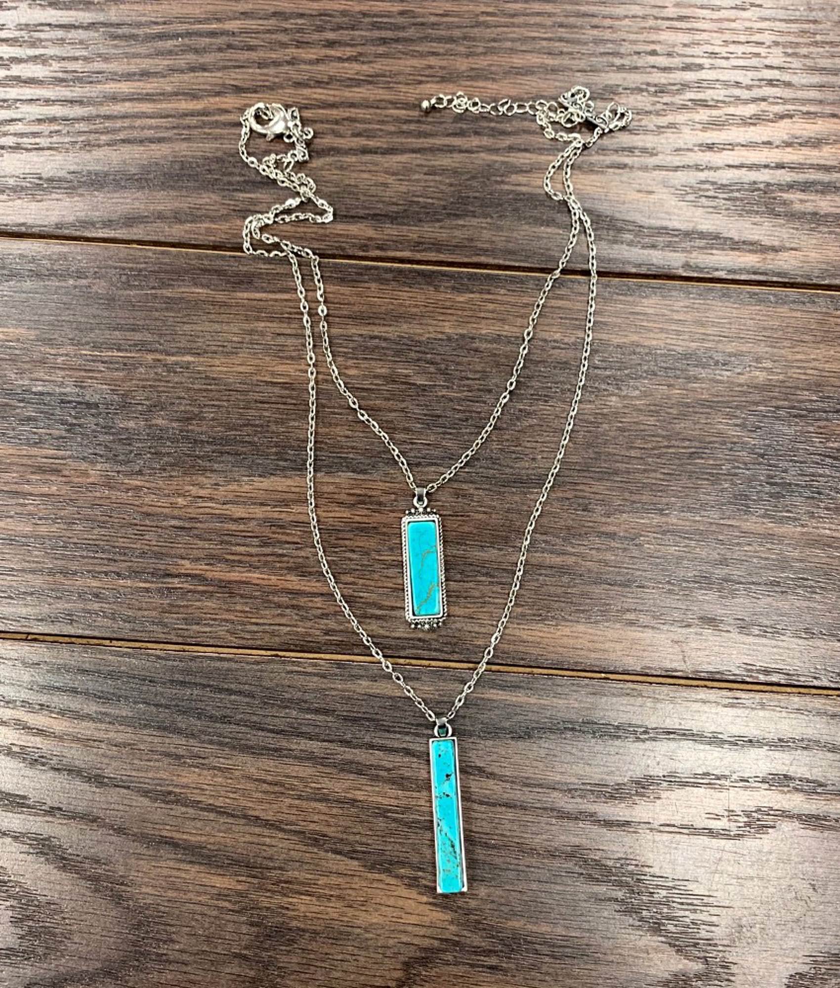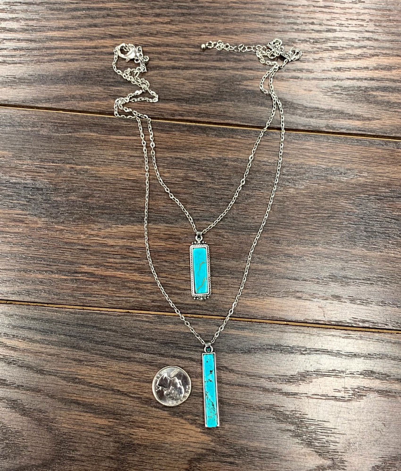 The Skinny: 0" to 23" Long, 2-strand Bar Turquoise Necklace * Natural stone may vary in size, color or shape * 2-strand (16", 20" long) necklace and 3" extender * Small base metal chain necklaces * 1.5" top and 2" bottom turquoise pendants on alloy metal, antique silver plate * 30 grams weight * Nickel, Lead and Chrome free