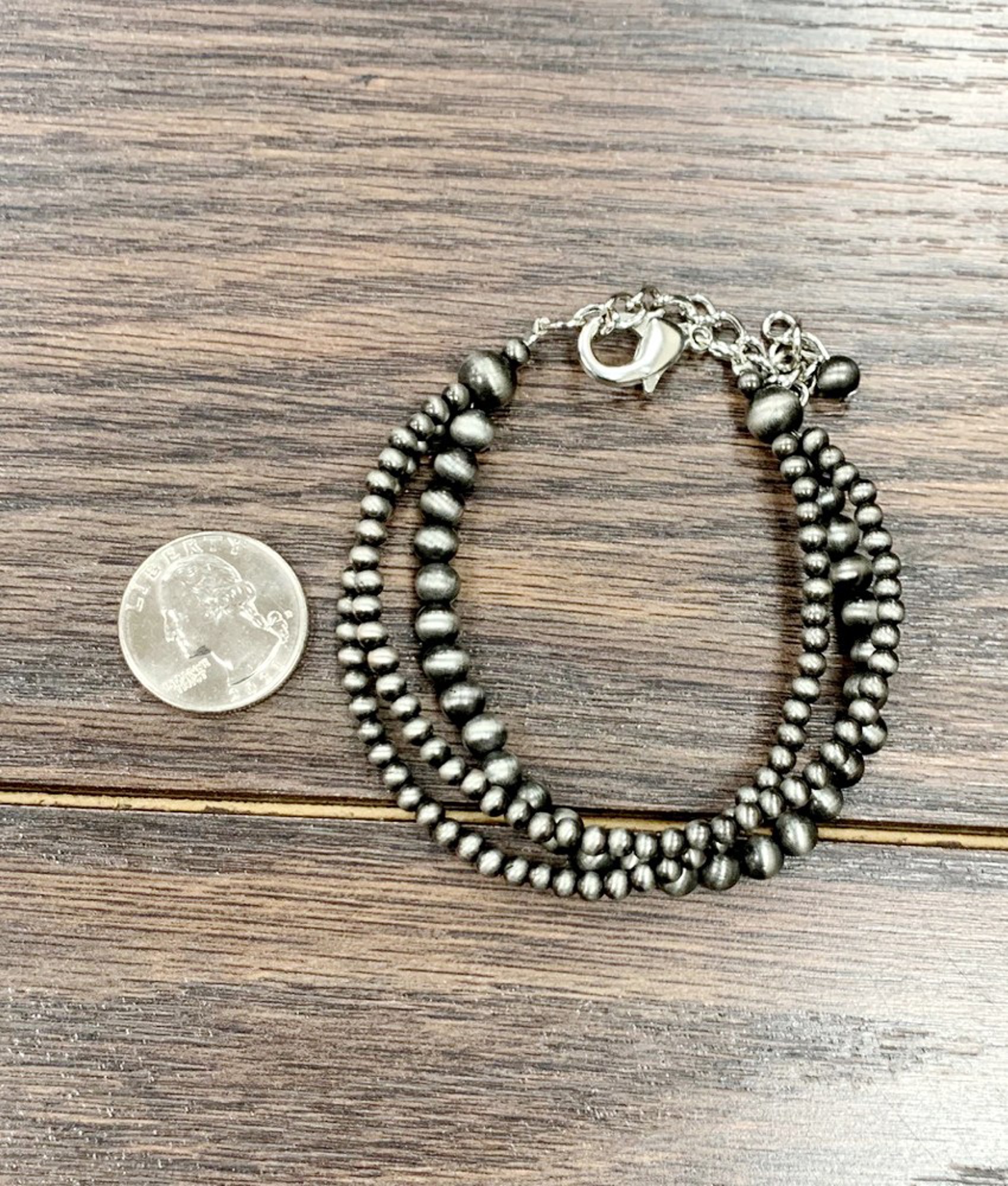 The Skinny: Handmade 3-strand Navajo Bead Adjustable Bracelet * Adjustable bracelet * 3-strand 7.5" long bracelet and 3" extender * 2-strand 4mm navajo bead * 1-strand 6mm navajo bead * 10 grams weight * Nickel, Lead and Chrome free