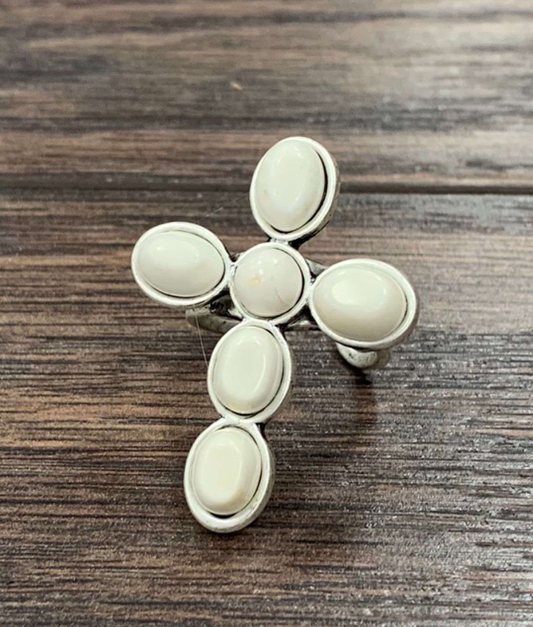 The Skinny: 1.5" Long, Cross White Turquoise Ring, Brass Dual Adjustable Band * Adjustable by expanding only both bands, not white turquoise * Natural stone may vary in size, color, or shape * One size, Adjustable by pull/push brass dual band * 1.5" ring on alloy metal, antique silver plate * 10 grams weight * Nickel, Lead and Chrome free