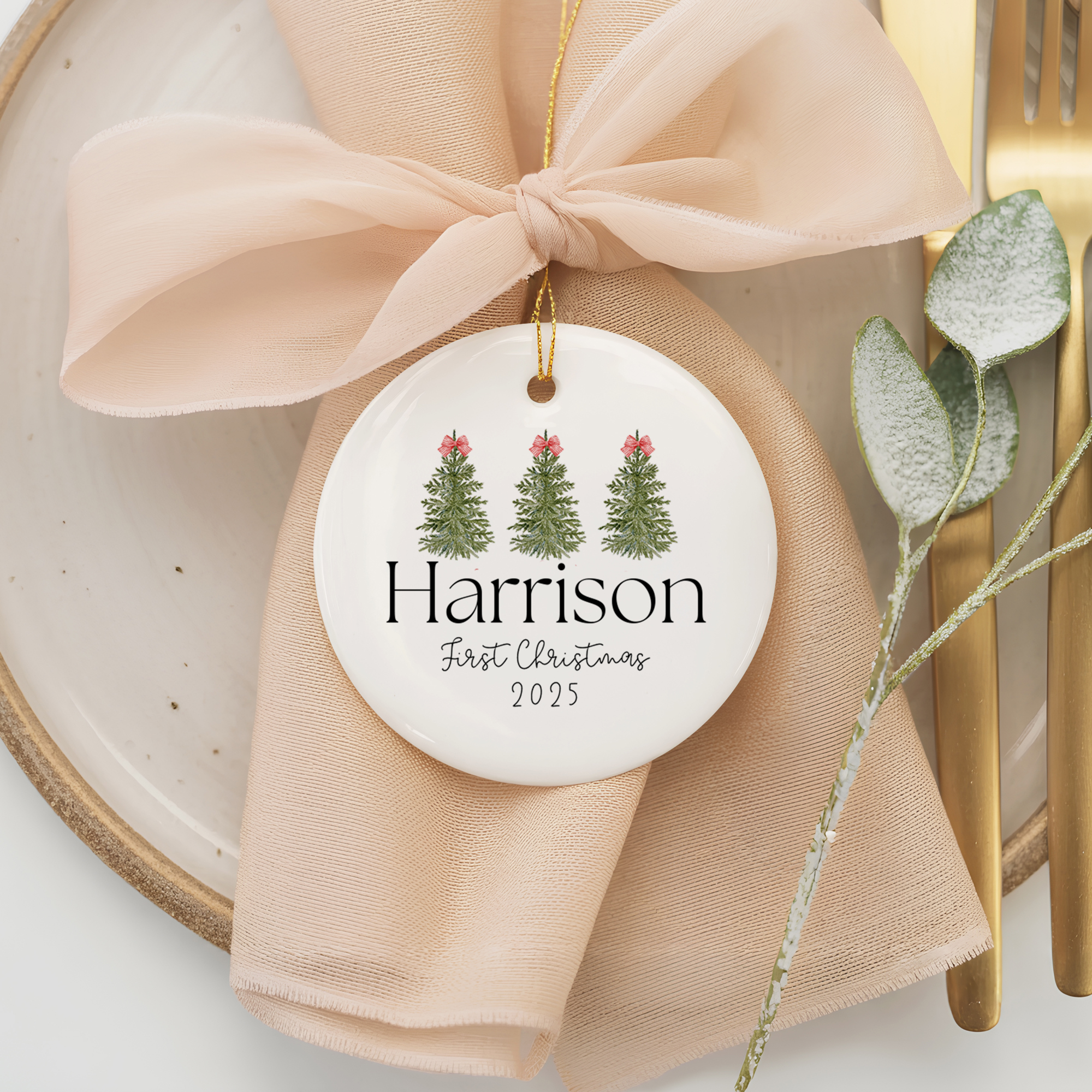Make your baby's first Christmas truly memorable with this personalized baby name ornament, featuring adorable teddy bear, rocking horse, and building blocks designs. This custom infant decoration comes complete with a charming pink bow and is perfect as a newborn keepsake or special first Christmas gift.
