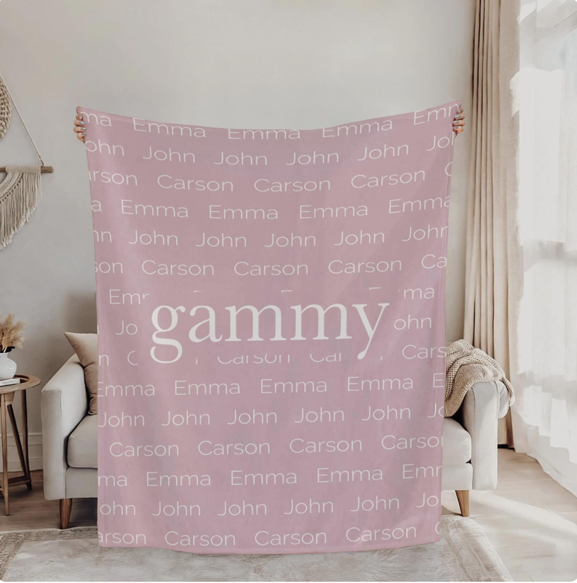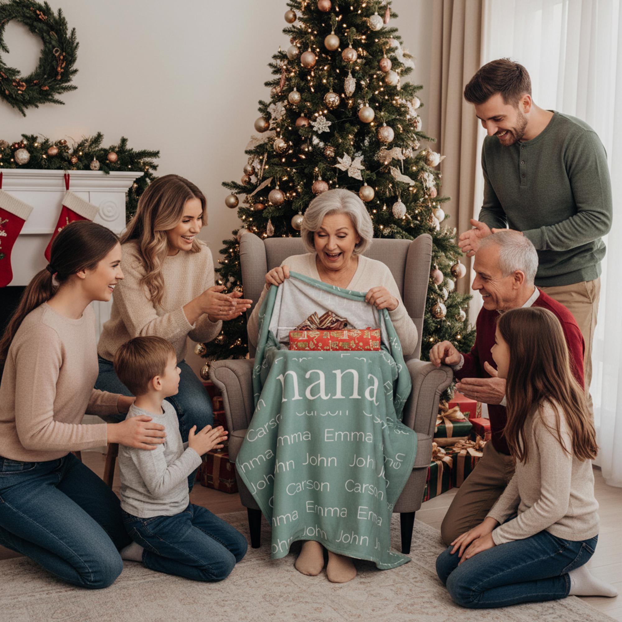 Surprise your beloved grandmother with this personalized Nana blanket featuring custom family names that transforms into a cherished keepsake memory throw. This plush cozy sherpa blanket makes the perfect birthday present or grandma gift idea, combining soft minky material with personalized details to create a meaningful grandmother keepsake.