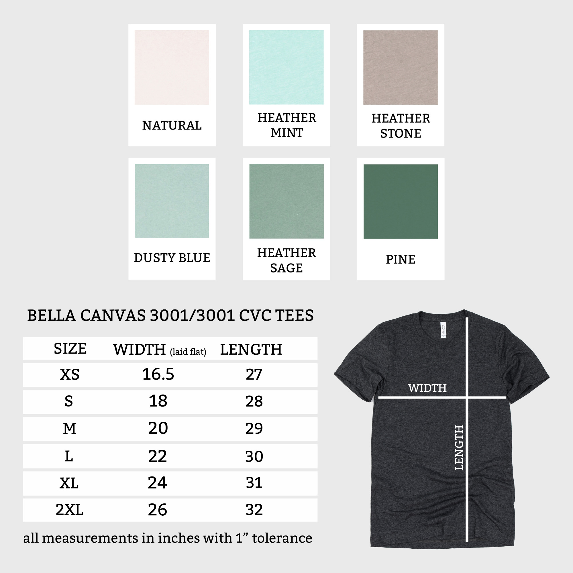 - We use unisex/men-s fit tees from Bella Canvas (models 3001/3001CVC).