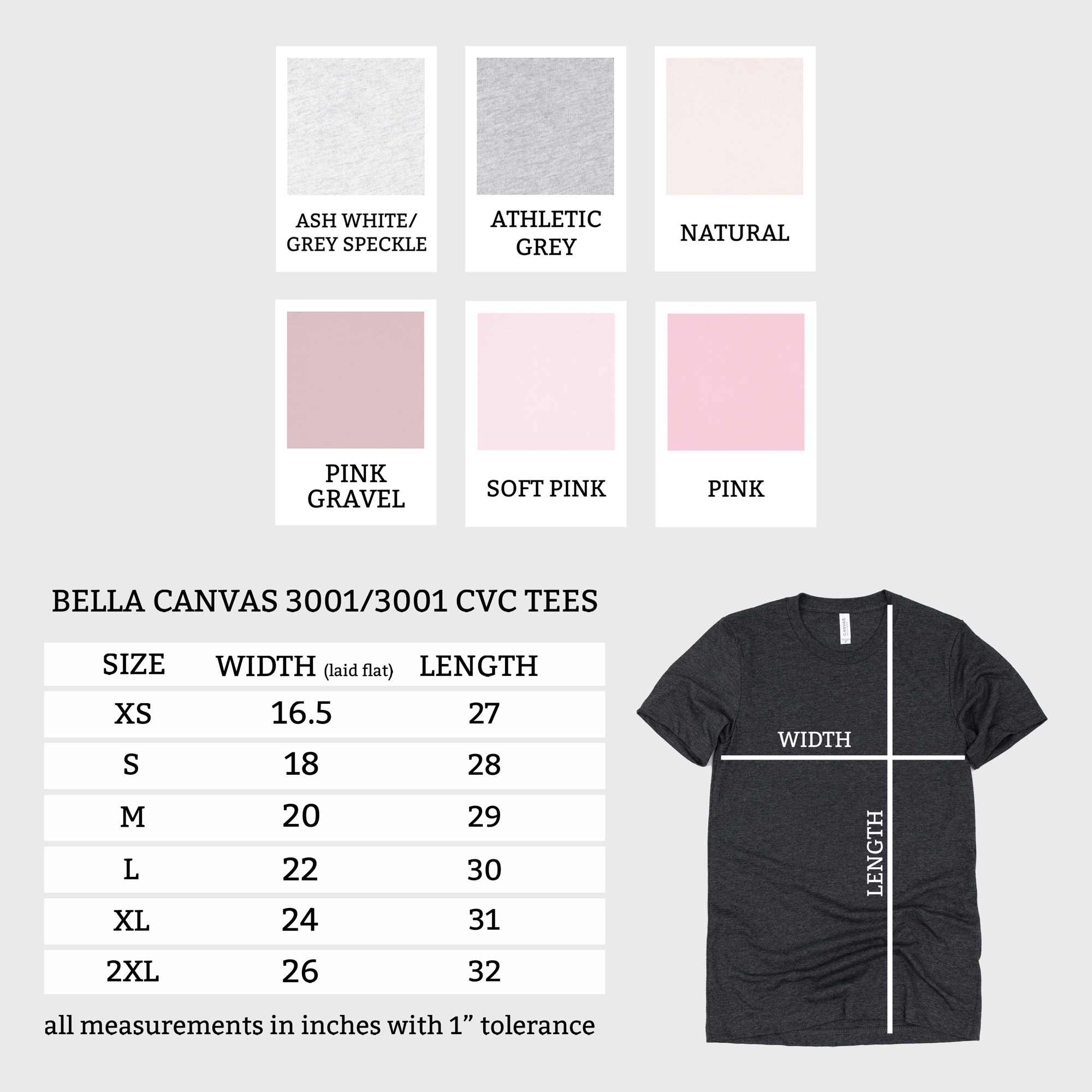 - We use unisex/men-s fit tees from Bella Canvas (models 3001/3001CVC).