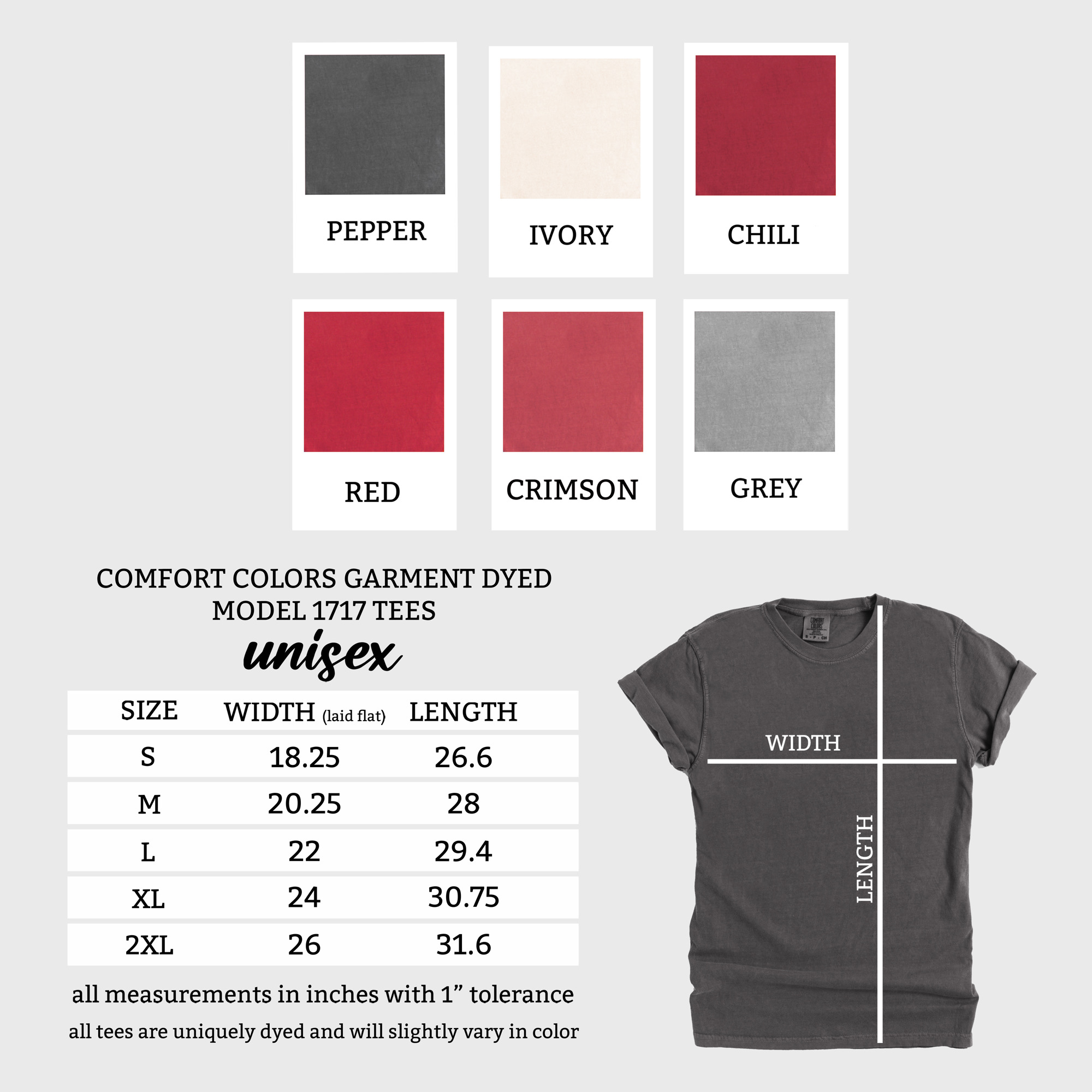 - We use unisex/men-s fit tees from Comfort Colors, model number CC1717.