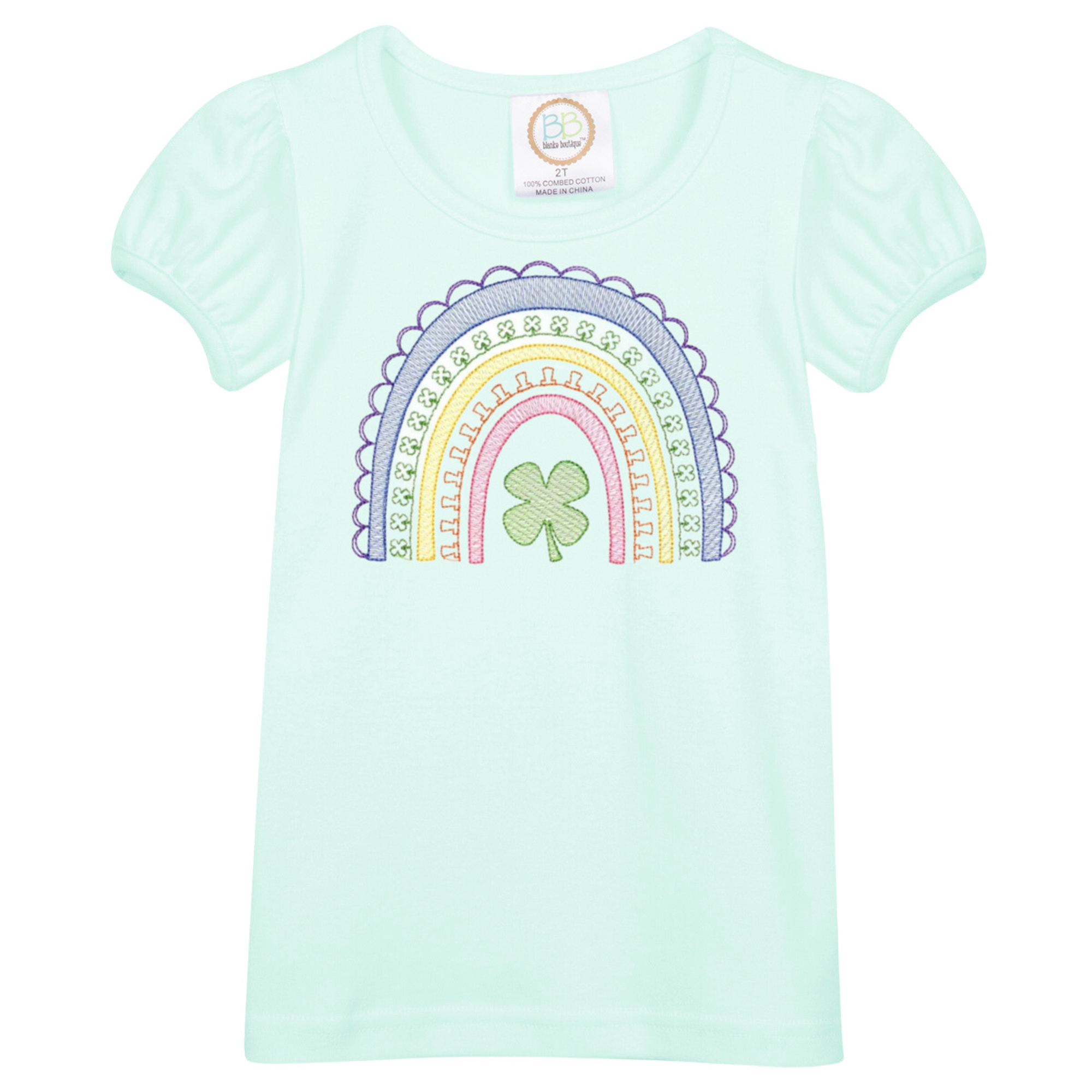 This adorable tee features a beautifully embroidered rainbow made with soft pastel stitching, finished with a lucky green clover at the center. The delicate embroidery gives it a boutique, heirloom-quality feel while keeping the look playful and perfect for St. Patrick’s Day celebrations, school parties, and springtime fun.
