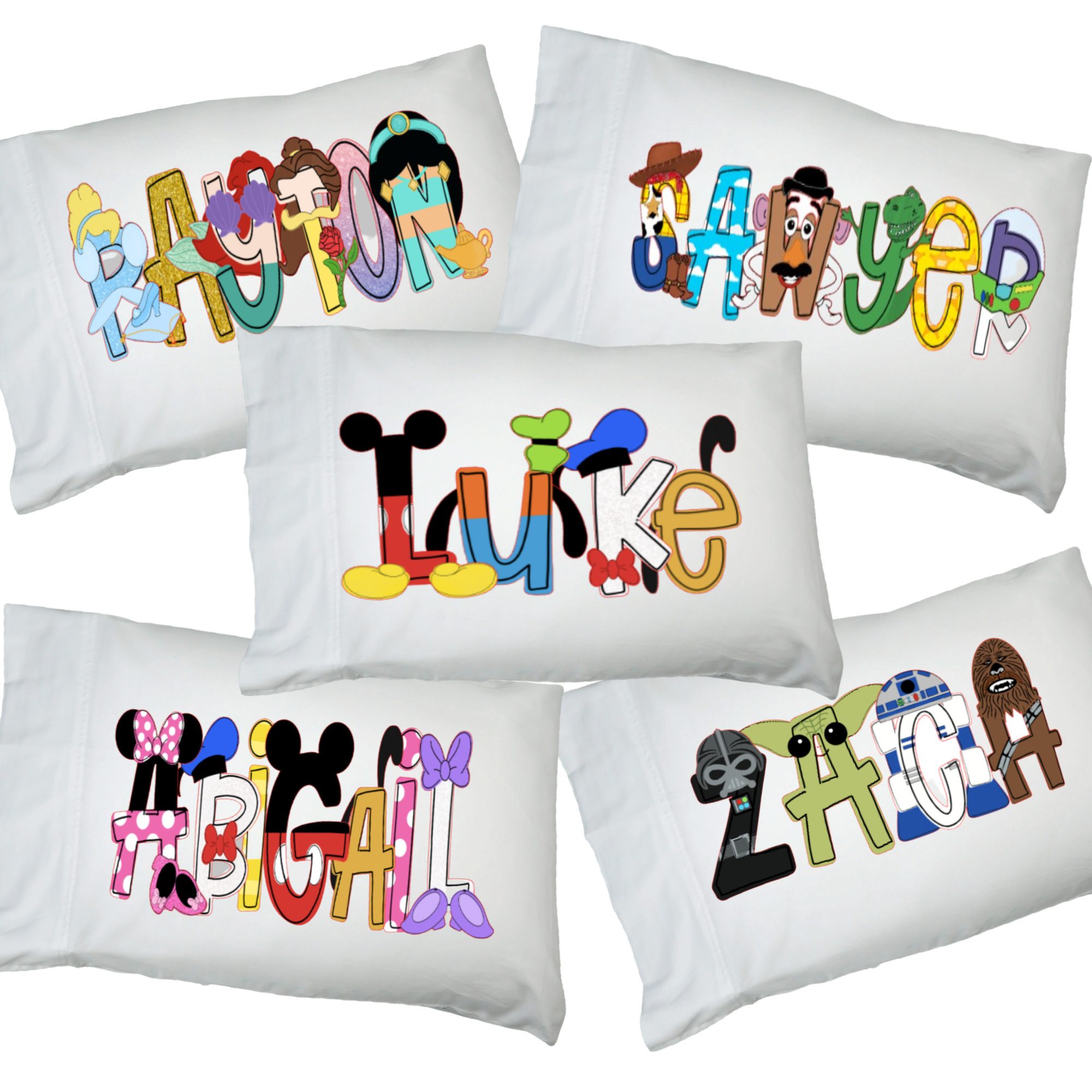 My Character Alphas are the most popular on pillowcases!! The alphas are dye sublimated onto the standard size pillowcase. Each alpha is made up of many characters and patterned letters that we use to create the perfect design for you. Every letter is available in every character. Each name will have a minimum of 4 characters. The letters are graphic files. They are meant to look whimsical and fun. Each name will look different depending on the length of the name. With over 24 options, there is something for everyone!!
